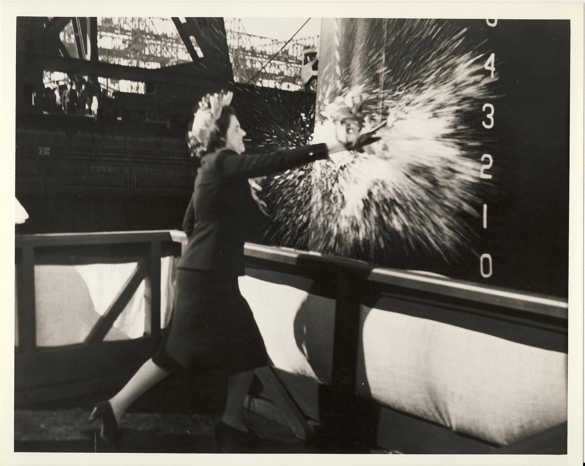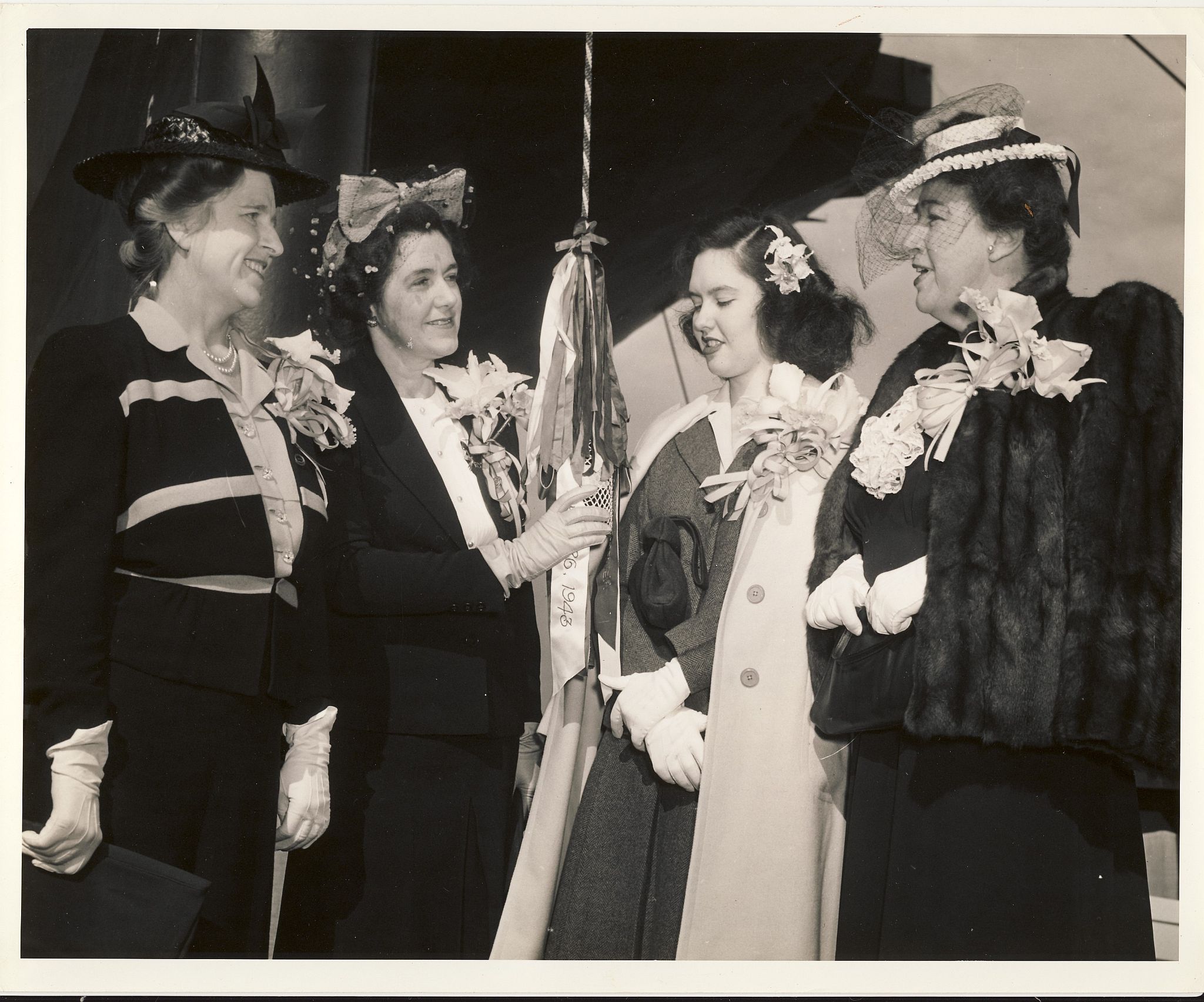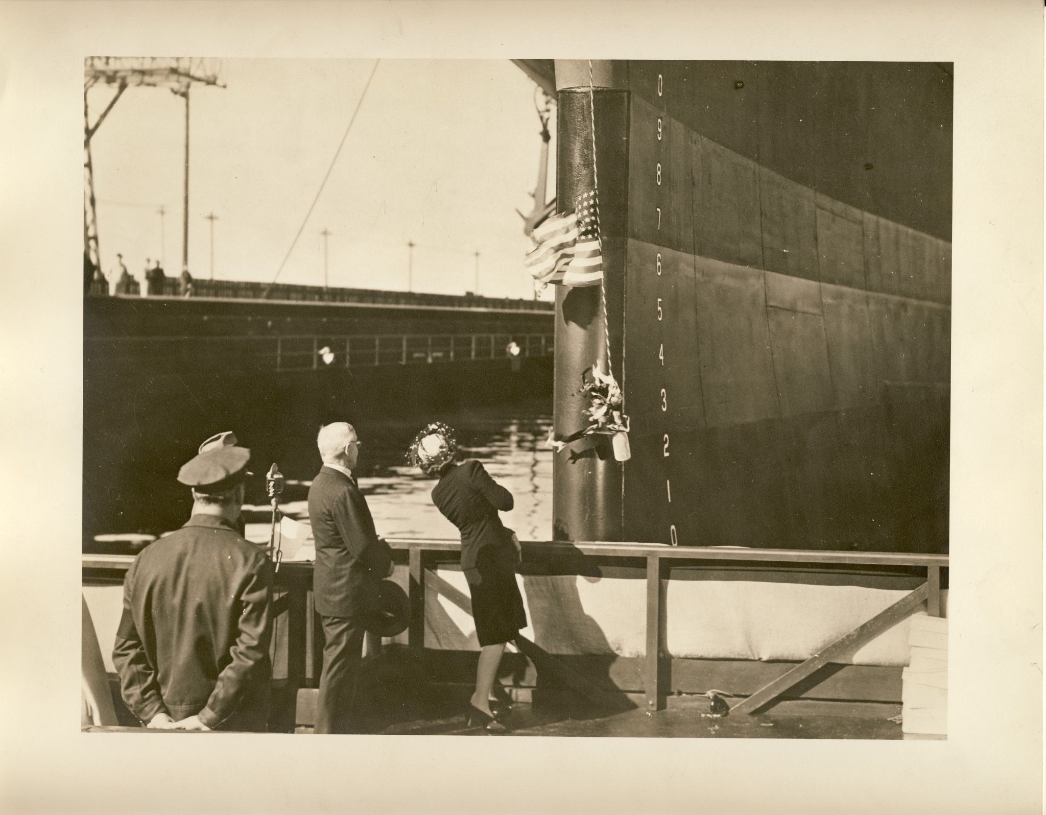 465k | Ship's sponsor, Mrs. John Howard Hoover (née Helen Braconier Smith), is in the middle, with the christening bottle in her hand. |