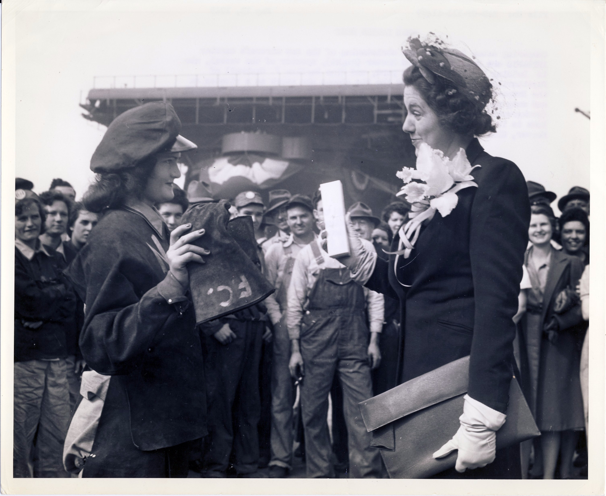 532k | "WHEN LADIES MEET—Comparing notes following the christening of the new aircraft carrier Intrepid are Mrs. John Howard Hoover (right), sponsor of the vessel, who is holding her gift from the yard, and Miss Berline F. Cashwell of Fayetteville, N. C., who holds the big gloves she wears as a riveter at the Newport News (Va.) Shipbuilding and Dry Dock Company. Miss Cashwell and many young women like her are helping to build ships like the Intrepid (background) which was christened on April 26, 1943. Mrs. Hoover, whose home is in Washington, D. C., is the wife of Vice Admiral John Howard Hoover, USN." File No: LAU-CV-111-41489. |