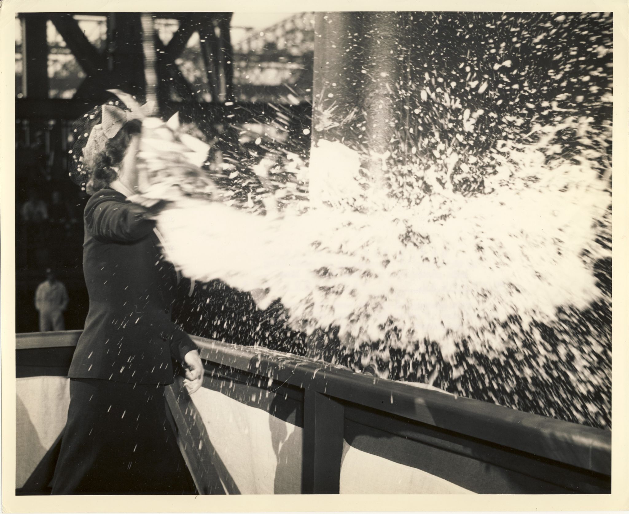 396k | "Mrs. John Howard Hoover splashes champagne over the bow of the aircraft carrier Intrepid at its April 26, 1943 christening at Newport News, Virginia. It took Mrs. Hoover, the wife of Vice Admiral Hoover, three swings to break the champagne bottle over the Intrepid, which became the fourth ship to bear the name. The Intrepid was the third aircraft carrier launched by the Newport News Shipbuilding and Dry Dock Company following Pearl Harbor." |