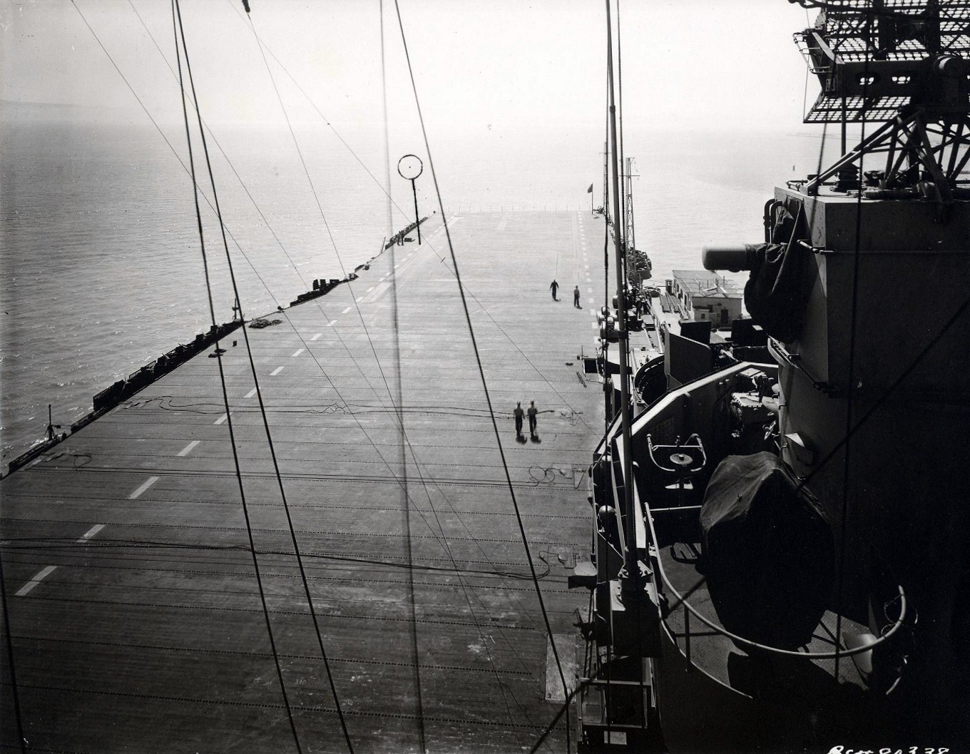 260k | "It is not all work for the men of the USS Intrepid (CV-11). Volley ball." However, the "Beware of Propellers" admonition reminds that this is one of the most dangerous workplaces in the world. Photo is dated 10 February 1944. National Archives and Records Administration (NARA), photo # 80-G-227150. |