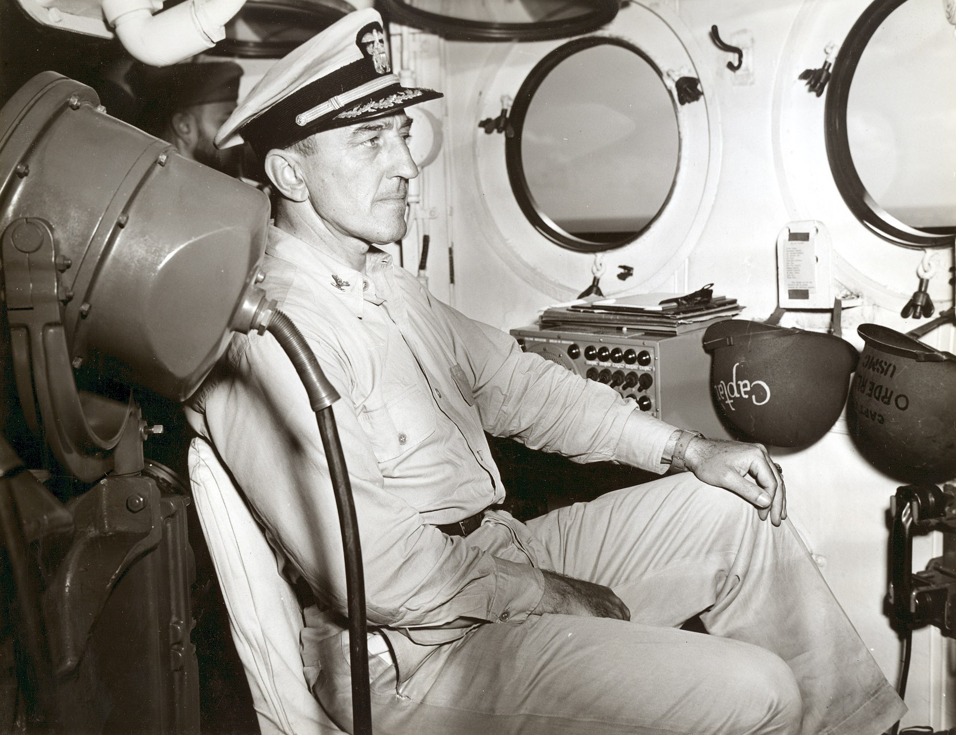 603k | The ship's first commanding officer, Captain (later Admiral) Thomas L. Sprague, aboard USS Intrepid (CV-11), 1943–1944. This image is part of a photograph album detailing the wartime service of the carrier Intrepid in the Pacific during World War II. Photo courtesy of the National Naval Aviation Museum (NNAM). |