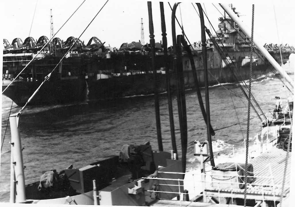 85k | USS Aldebaran (AF-10) and USS Intrepid (CVA-11) during an underway replenishment, circa 1962, probably in the Mediterranean Sea. US Navy photo |