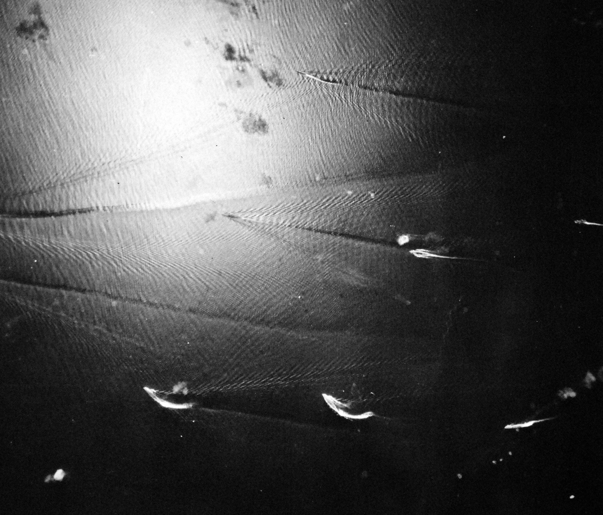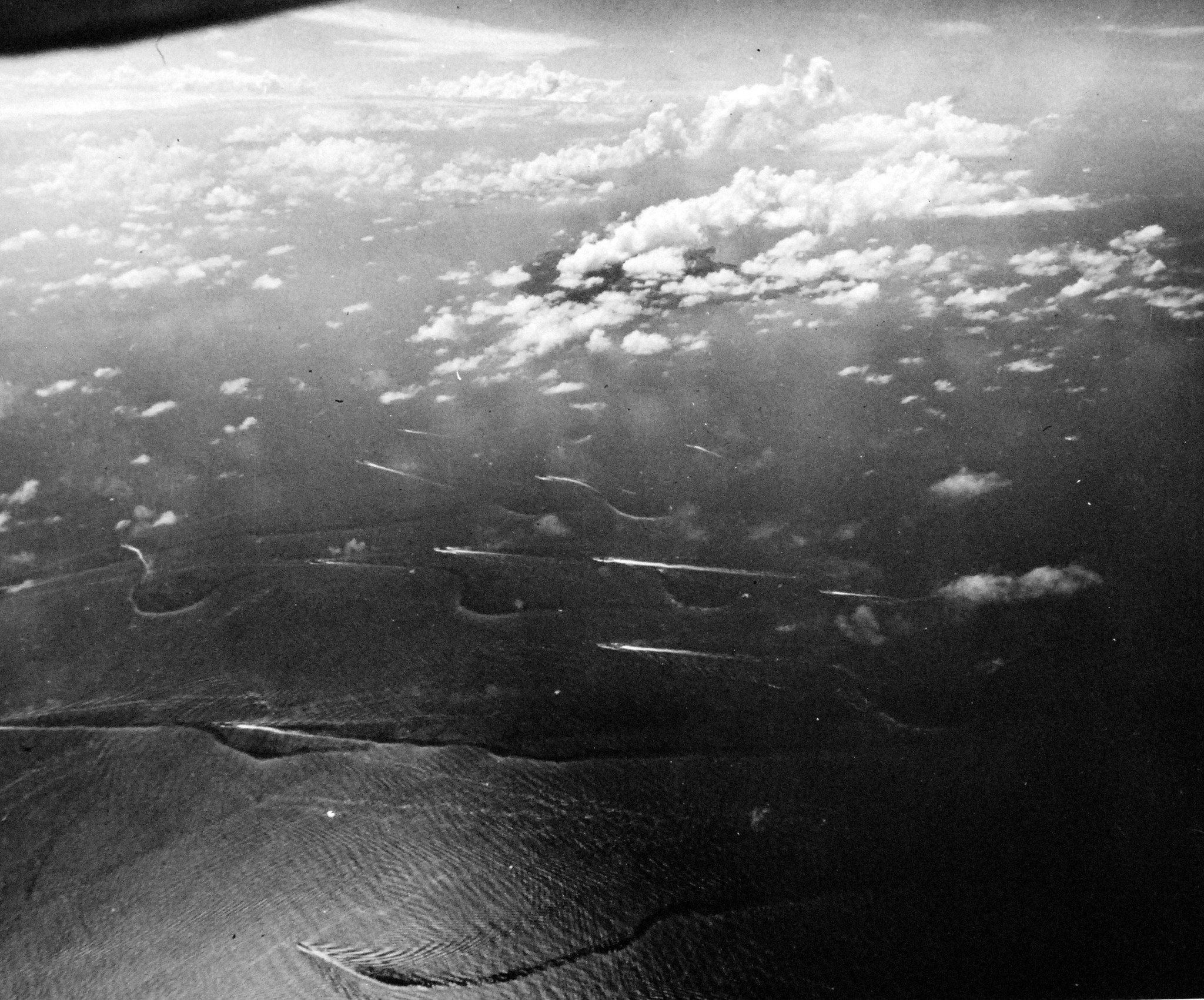 1.43M | The letters "U S" formed by SB2C-1 Helldivers of Bombing Squadron (VB) 8 of USS Intrepid (CV-11). Photographed 25 October 1943. U.S. Navy photograph, now in the collections of the National Archives and Records Administration (NARA), # 80-G-209850. |