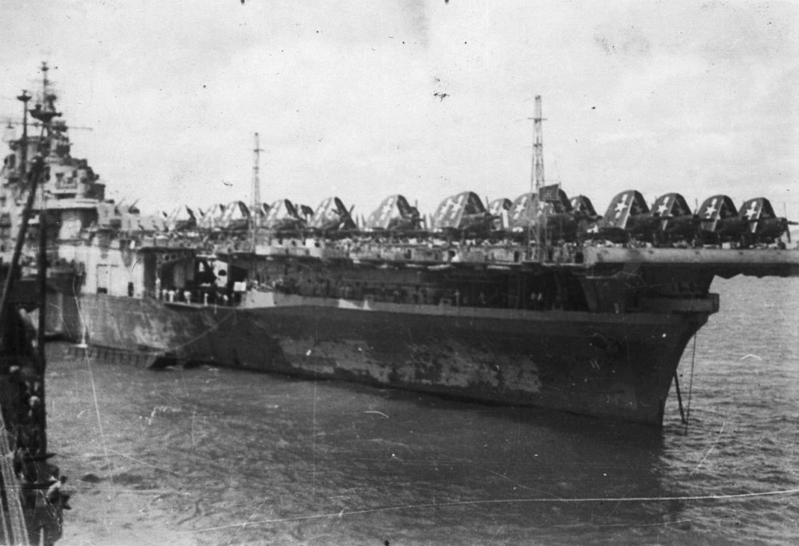 669k | USS Intrepid (CV-11) underway, 26 January 1944, on her way to launch strikes against Truk Atoll (now Chuuk Lagoon). The forward flight deck is filled with Carrier Air Group 6 SBD Dauntless and TBF/TBM Avenger aircraft. Note there is a single F4U Corsair on the outrigger sponson. |