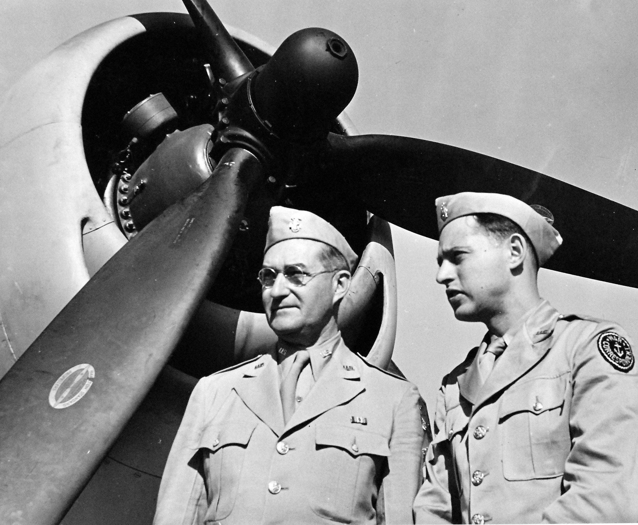 567k | American War Correspondents aboard USS Intrepid (CV-11): William J. Wheatley of Washington Evening Star and William H. Pickents of Trans. Radio. Photographed 6 October 1943. U.S. Navy photograph, now in the collections of the National Archives and Records Administration (NARA), # 80-G-209842. |
