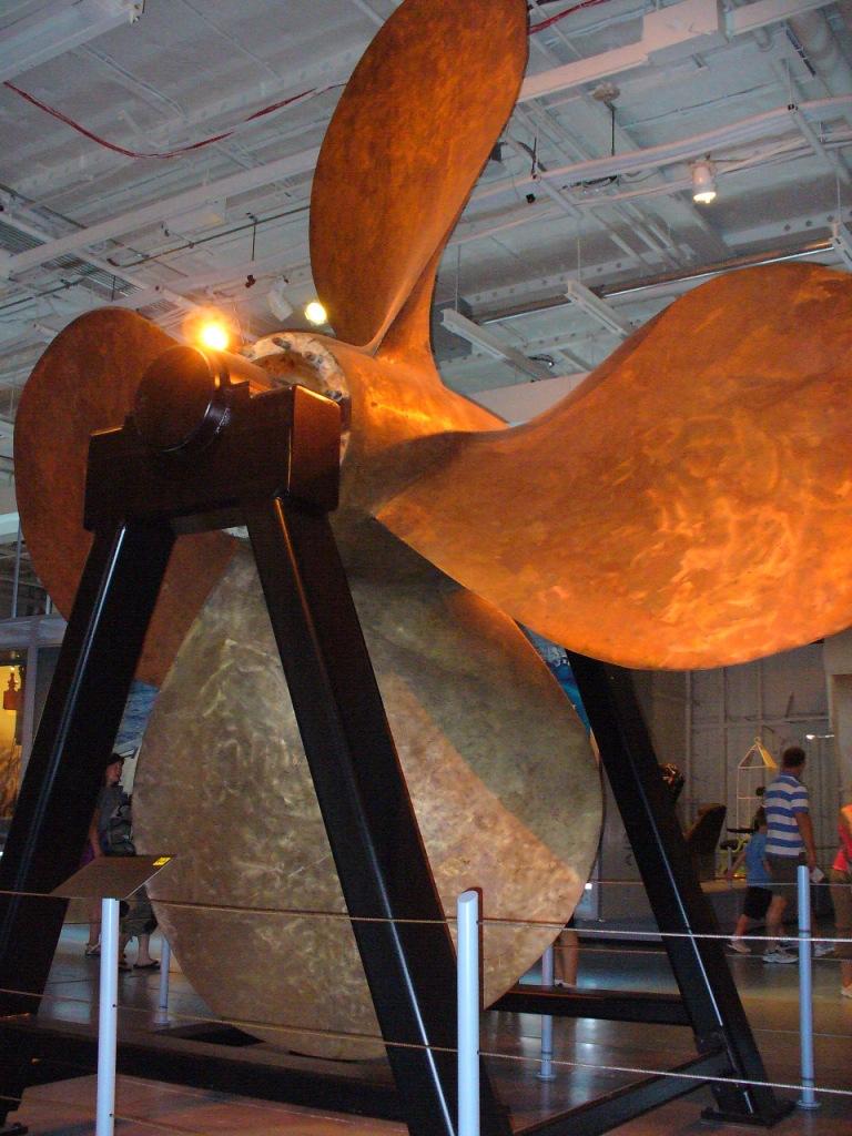 124k | Ship's propeller. It is on display in the Hangar Deck of the Museum and has a diameter of about 15 feet (4.57 meters). |