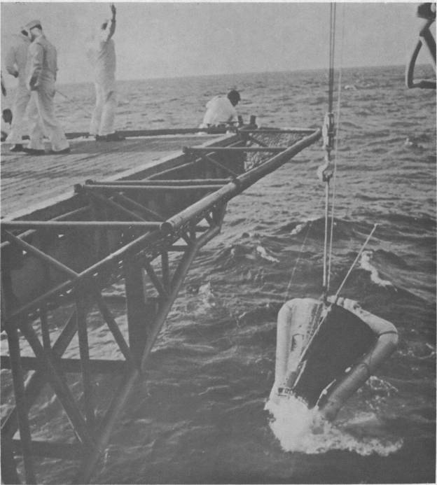 46k | Gemini 3 spacecraft being hoisted on board, 23 March 1965. LCDR John W. Young and Maj. Virgil I. Grissom, in Molly Brown, splashed down some 50 miles from Intrepid after history's first controlled re-entry into the earth's atmosphere ended the pair's nearly perfect three-orbit flight. A Navy helicopter lifted the astronauts from the spacecraft and flew them to Intrepid for medical examination and debriefing. Later Intrepid retrieved Molly Brown and returned the spaceship and astronauts to Cape Kennedy. This was Project Gemini's first manned flight. | NHC | |||||||||||