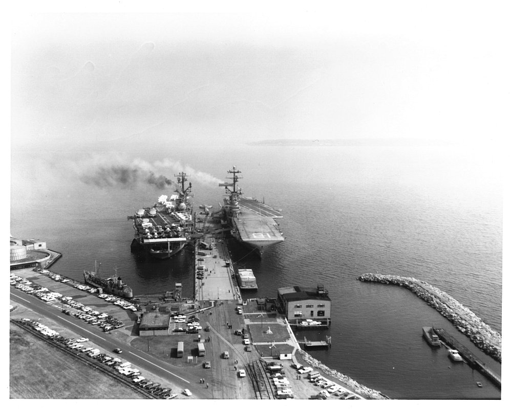 155k | This photo may have been taken around noon on Sunday, 12 September 1965. USS Intrepid (CVS-11) moved from the New York Naval Shipyard, Brooklyn, New York, to Naval Supply Center, Bayonne, New Jersey, to complete her FRAM (Fleet Rehabilitation and Modernization) overhaul. Verrazzano-Narrows Bridge (at the time spelled Verrazano, with a single "z") is in the distance. |