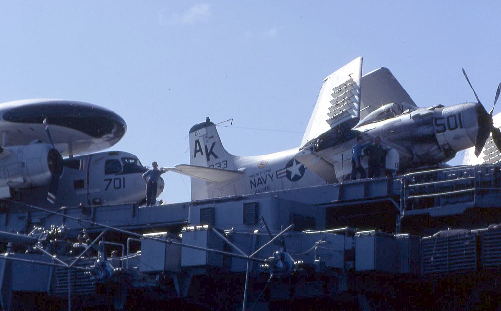 110k | A U.S. Navy Douglas EA-1F Skyraider (BuNo 132591, modex AK-783) of Carrier Airborne Early Warning Squadron (VAW) 33 "Night Hawks" Det.11 returning to the aircraft carrier USS Intrepid (CVS-11) after an ECM mission over North Vietnam in July 1967. VAW-33 Det.11 was assigned to Carrier Air Wing (CVW) 10 aboard Intrepid for a deployment to Vietnam from 11 May to 30 December 1967. Photos courtesy Gfeola. |