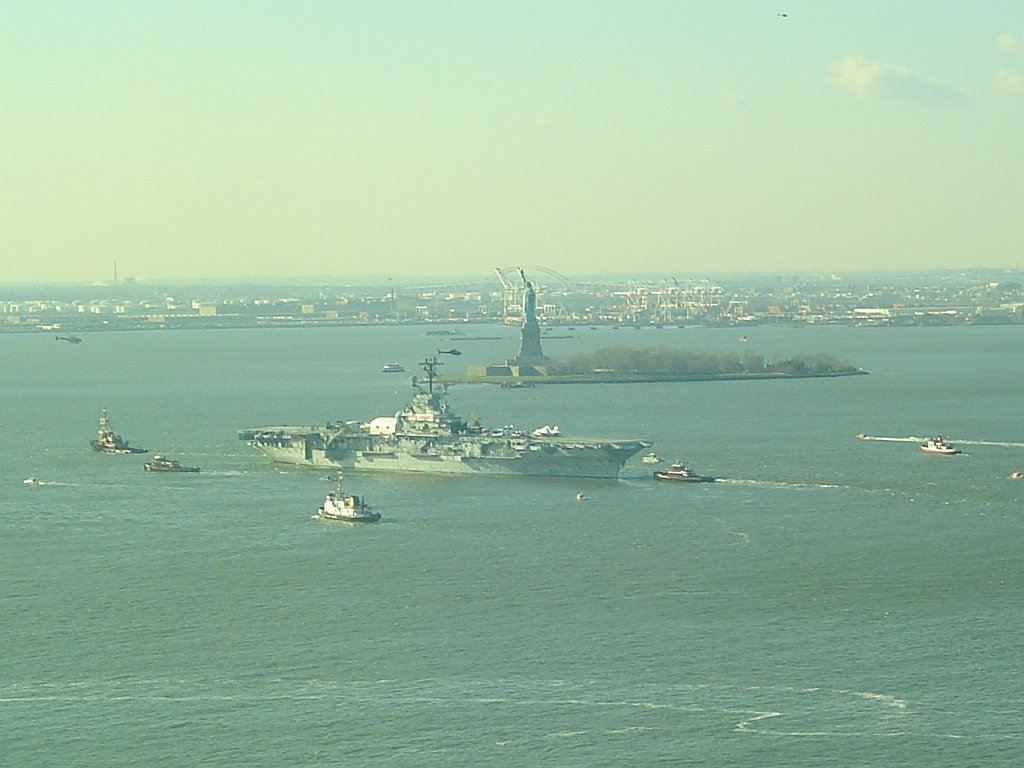 174k | New York City, December 5, 2006 (see photo NS021174.) A second attempt succeeded and Intrepid was towed to Bayonne, where her hull would be sandblasted and repainted. She will be towed again to Staten Island in late spring, to have her exhibition spaces renovated, and is expected to return to Pier 86 in November 2008. Not only will the Museum be better, but it could be used as an emergency headquarters for various government agencies should an incident occur. Sixteen Intrepid's former crewmen unfurled a giant American flag in honor of those killed in the 2001 terrorist attacks ("Honor Our Heroes") as the ship passed "ground zero," in what has become a ritual for naval ships. NS021193a: Ellis Island in the background. NS021193b: The Statue of Liberty in the background. (Thanks to Chester Morris, Robert Hall & Michael J. Tricarico, Jr. who helped compile this information.) |