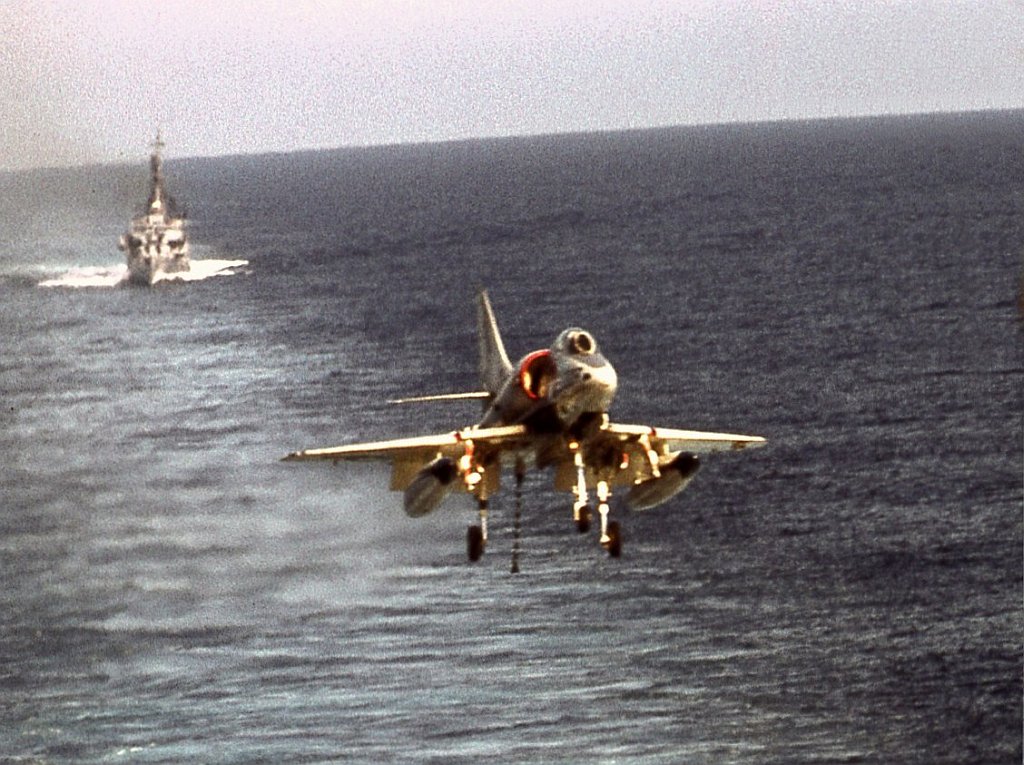 178k | An A-4B Skyhawk of VA-15 "Valions" about to land aboard USS Intrepid (CVS-11). Note plane guard destroyer in the background. |