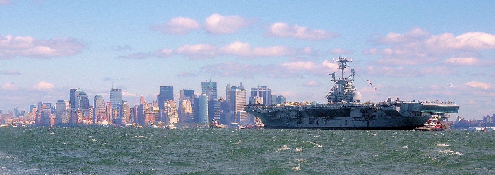 300k | Intrepid returning from Homeport Pier, Staten Island, to her home at Pier 86, Manhattan, 2 October 2008. |