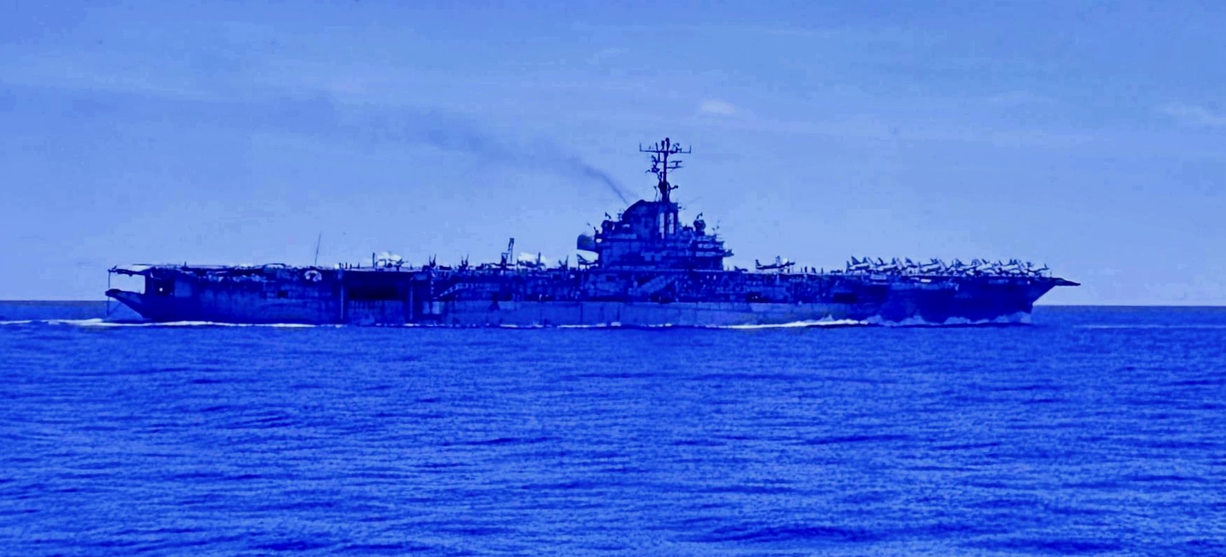 81k | USS Intrepid (CVS-11) steaming in the South China Sea, with her attack air group parked on the flight deck, 13 September 1966. Photographed by V.O. McColley. Official U.S. Navy Photograph (# K-33170). |