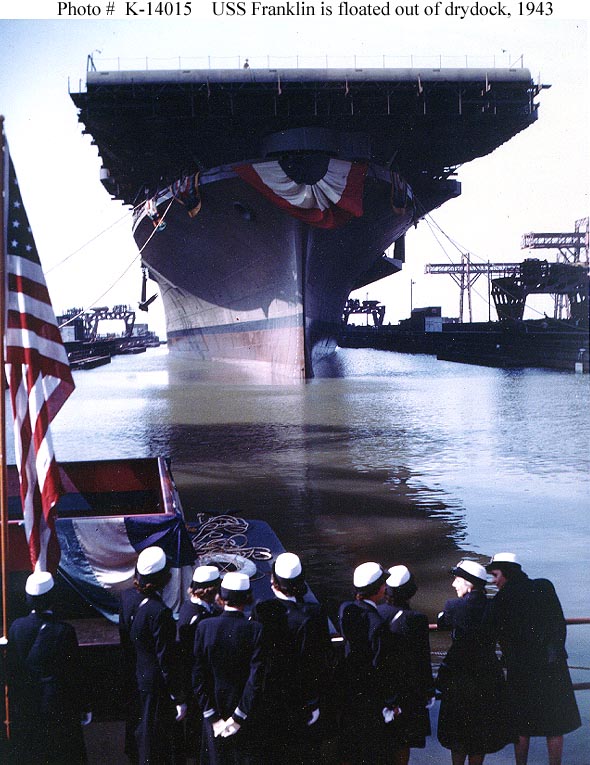107k | The ship is floated out of her building dock immediately after christening, at the Newport News Shipbuilding and Drydock Company shipyard, Newport News, Virginia, on 14 October 1943. Note WAVES officers in the foreground. The WAVES' Director, Lieutenant Commander Mildred H. McAfee, USNR, was Franklin's sponsor. Official U.S. Navy Photograph, now in the collections of the National Archives (photo # 80-G-K-14015). |