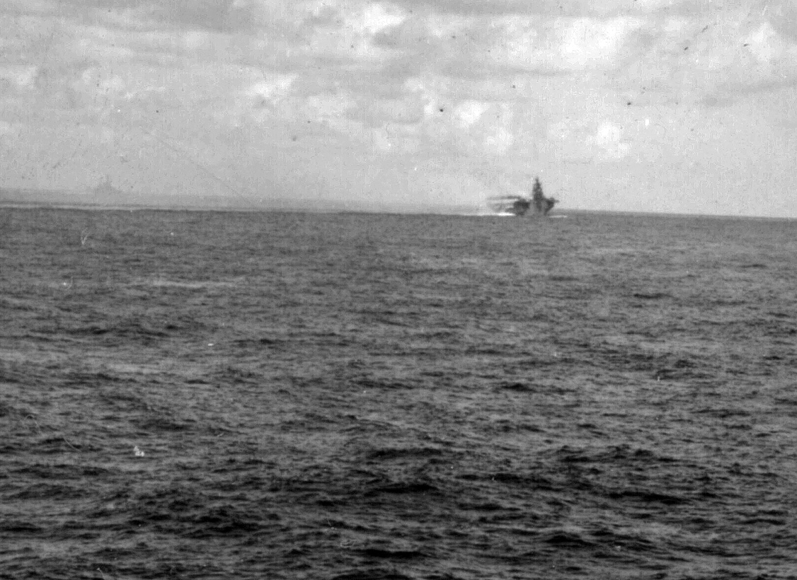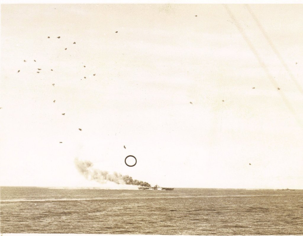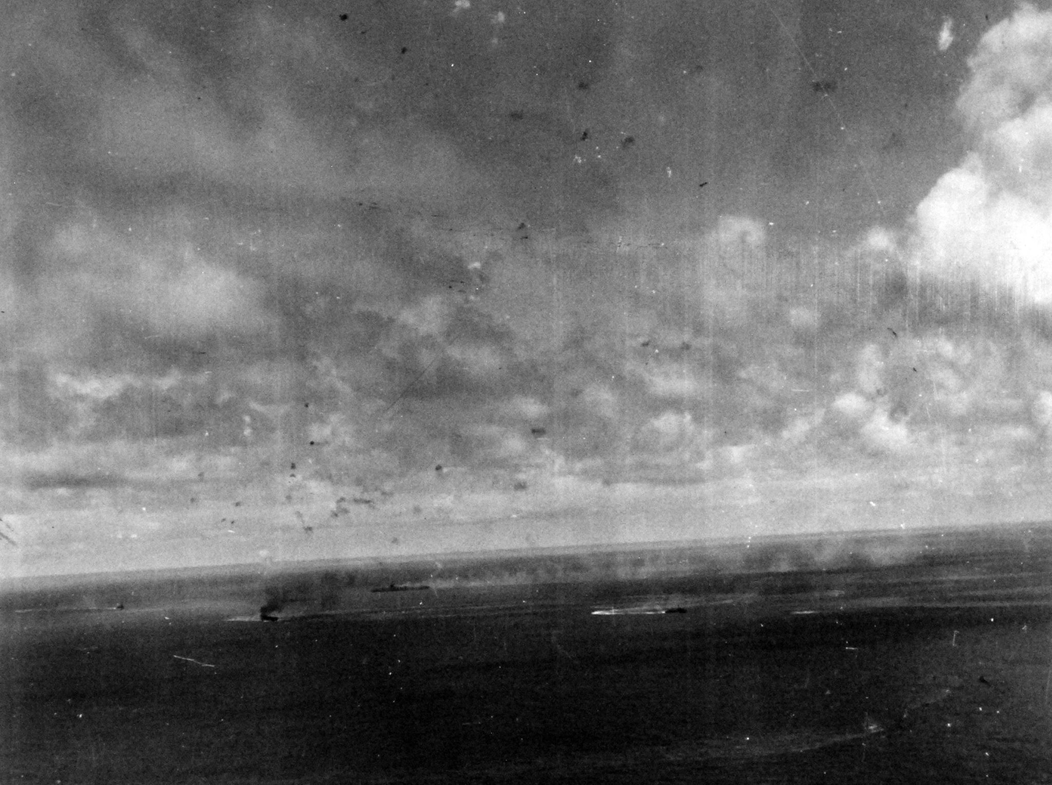 392k | Battle of the Sibuyan Sea. Japanese warships under attack by carrier-based planes. Note the light aircraft carrier, Zuiho, listing in the water. Taken from a plane from USS Franklin (CV-13), 24 October 1944. National Archives and Records Administration (NARA) photo, # 80-G-272553. |