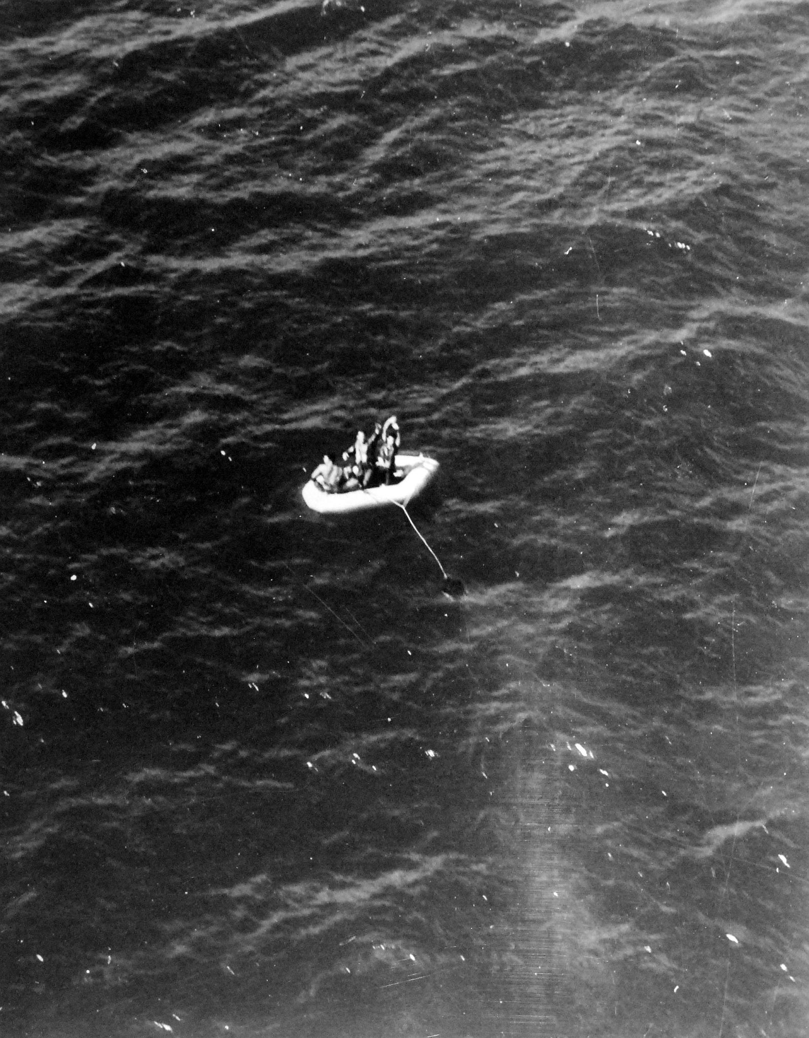 544k | Plane survivors (names unknown) in life rafts, probably during the North East Luzon fleet action. Taken by plane from USS Franklin (CV-13), 24 October 1944. National Archives and Records Administration (NARA) photo, # 80-G-272558. |
