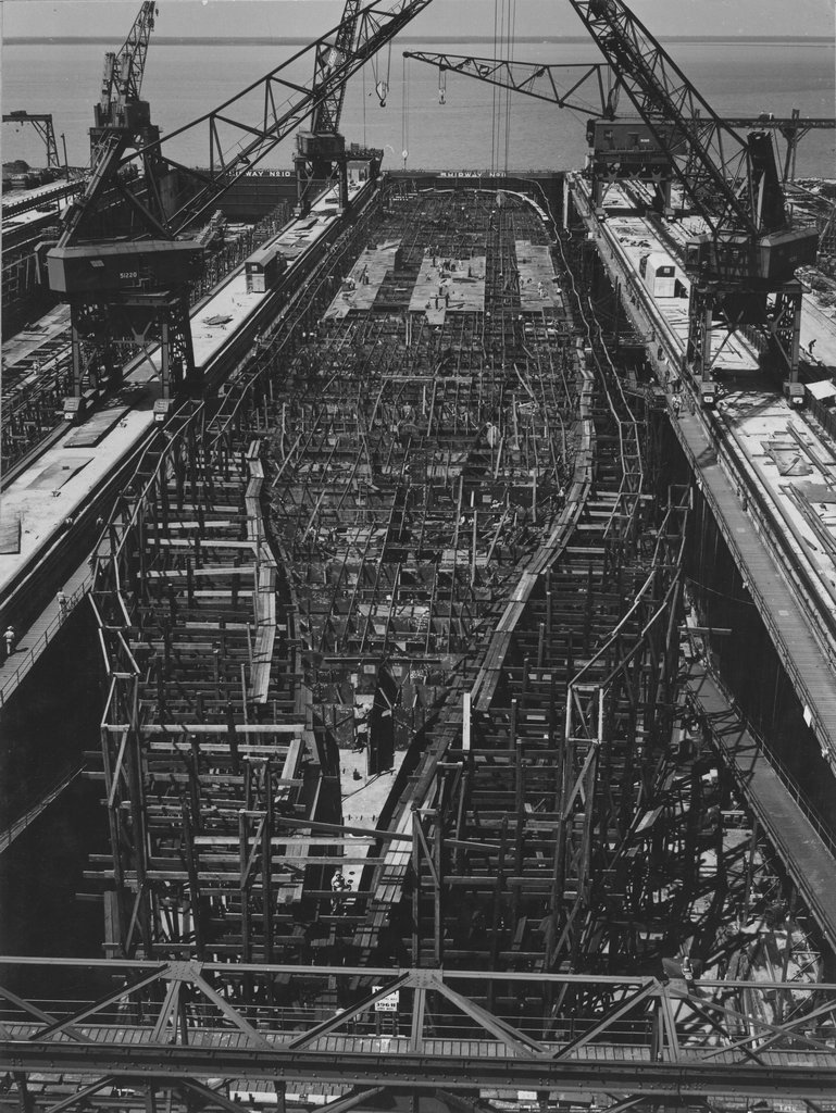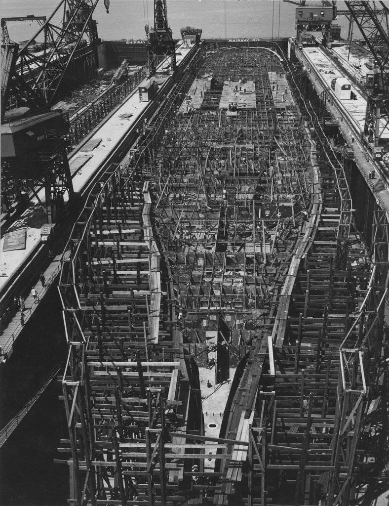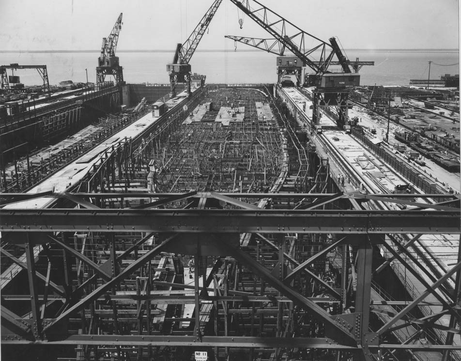 159k | The deck pieces for the second deck (just below the hangar deck) are starting to be placed in this May 1943 shot of CV-13 in Shipway number 11 at Newport News Shipbuilding. To the left is her sister ship CV-15 Randolph. (See also NS021362.) US Navy photo now in the 80-G collection at NARA College Park (# 80-G-474219). |