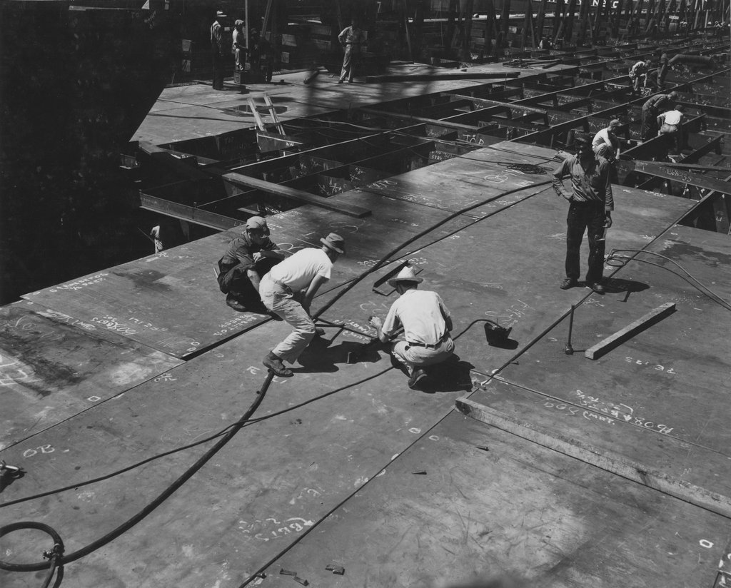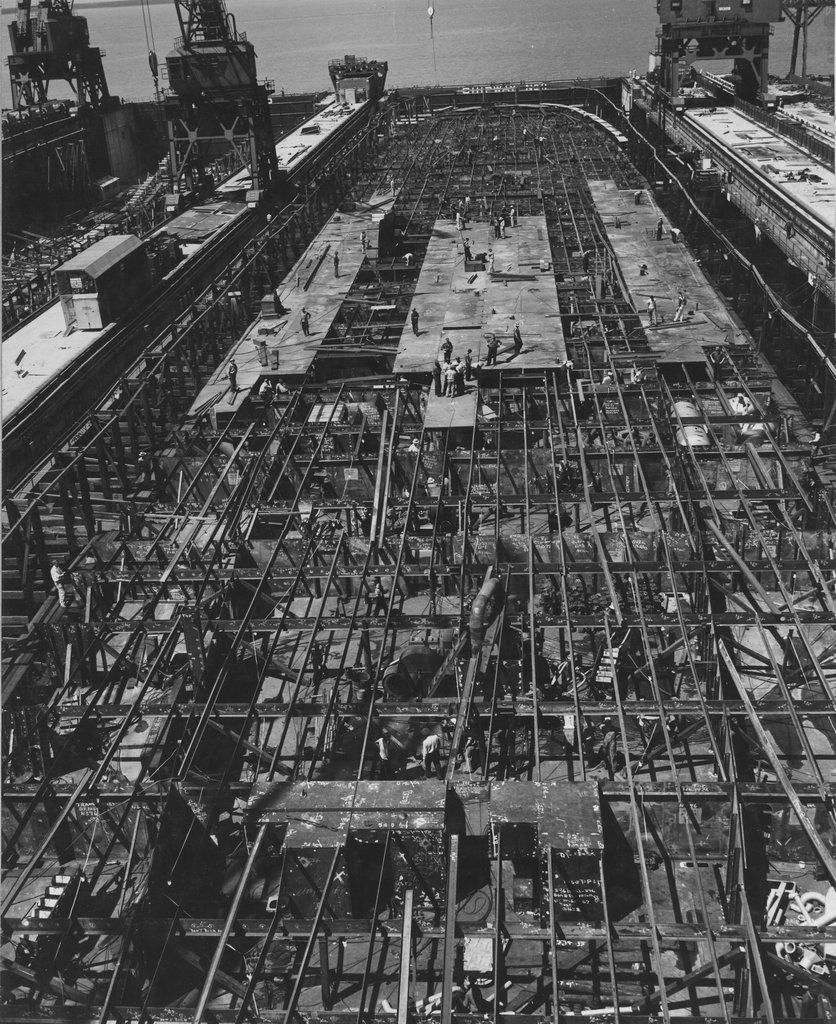 121k | Construction workers at Newport News Shipbuilding pull sections of Franklin's second deck into careful alignment before welding in May 1943. US Navy photo now in the 80-G collection at NARA College Park (# 80-G-474223). |
