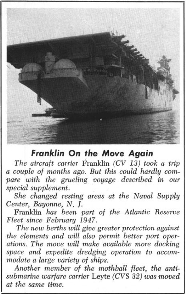 165k | "Franklin On the Move Again—The aircraft carrier Franklin (CV 13) took a trip a couple of months ago. But this could hardly compare with the grueling voyage described in our special supplement." "She changed resting areas at the Naval Supply Center, Bayonne, N.J." "Franklin has been part of the Atlantic Reserve Fleet since February 1947." "The new berths will give greater protection against the elements and will also permit better port operations. The move will make available more docking space and expedite dredging operation to accommodate a large variety of ships." "Another member of the mothball fleet, the anti-submarine warfare carrier Leyte (CVS 32) was moved at the same time." All Hands magazine, November 1964 issue, page 60. |
