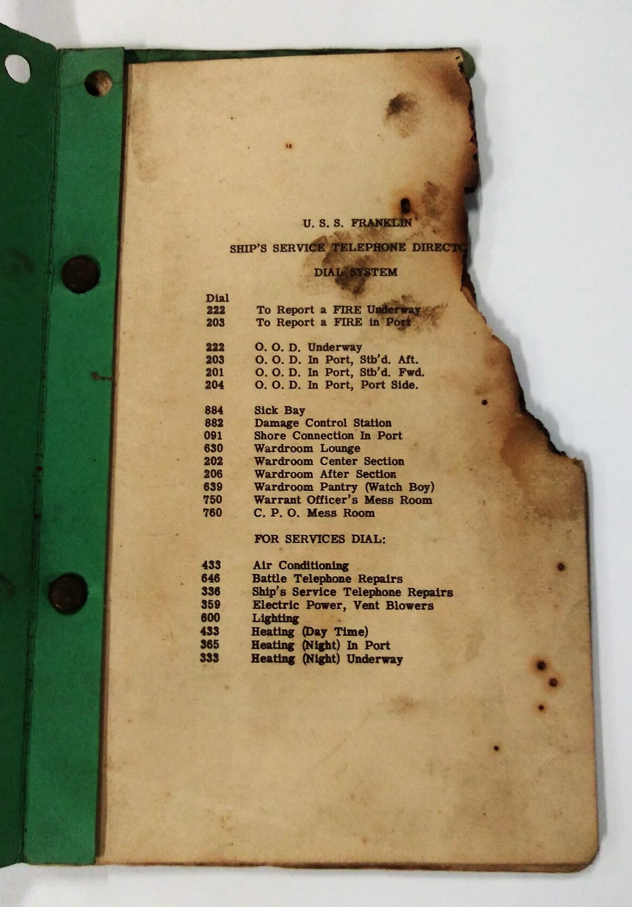 351k | USS Franklin (CV-13), Ship's Service Telephone Directory, probably burned after the kamikaze attack. |