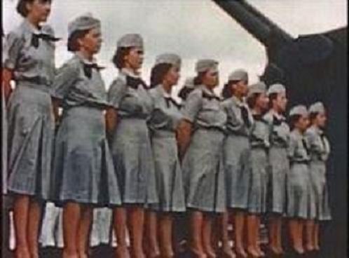 35k | USS Franklin (CV-13) was welcomed to Pearl Harbor and toured by 50 WAVES, mid-February 1945. Frame from Saga of The USS Franklin. |