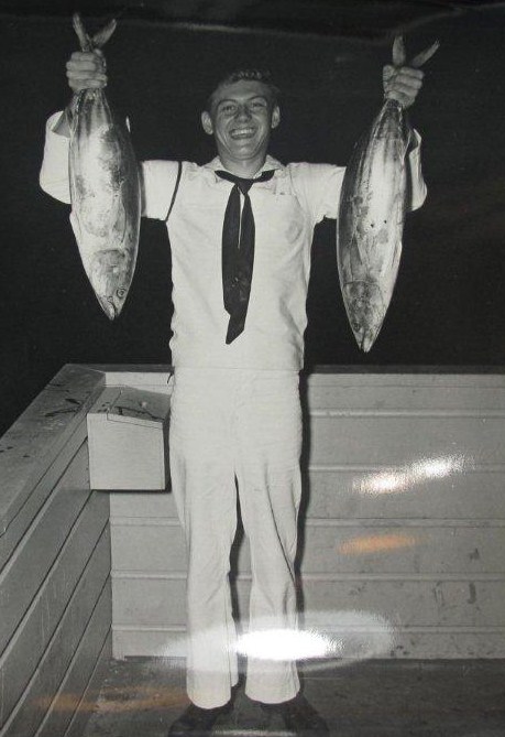 71k | "US Navy Sailor With Two Large Fish, USS Franklin (CV-13), WWII." From the Estate of a WWII US Navy Combat Photographer. |