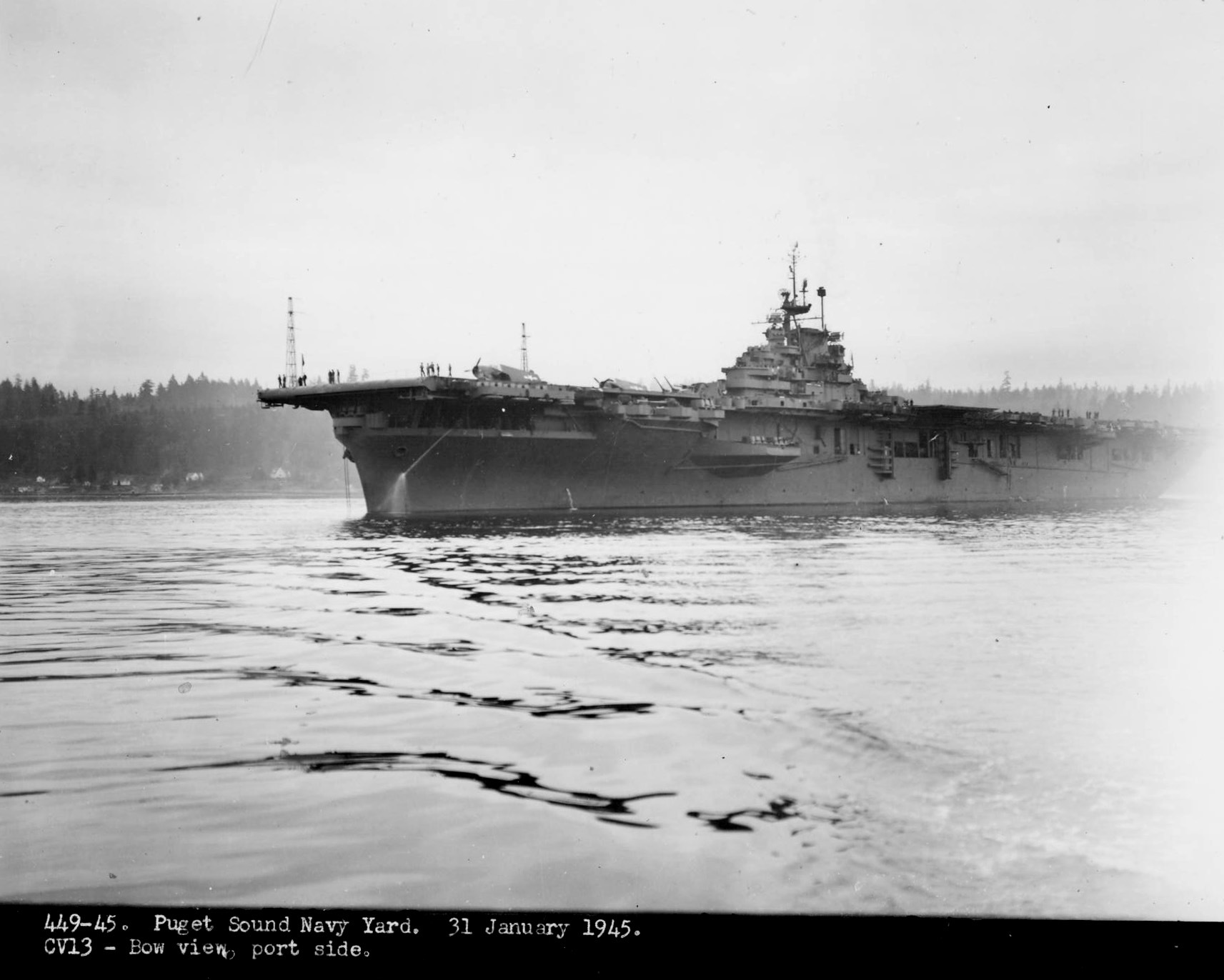 283k | USS Franklin (CV-13), Puget Sound Navy Yard, 31 January 1945. Bow view, port side. Photo #449-45. |