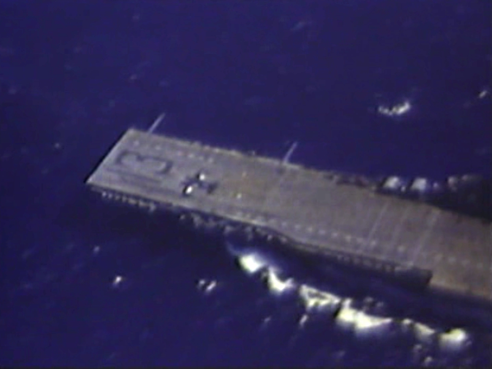 239k | A fighter launching from USS Franklin (CV-13), circa March 1945. This is a frame from a film showing aerial footage of clouds, a man looking out the window of an aircraft, brief footage of the damage to Franklin's flight deck, and aerial views of ships. National Archives and Records Administration (NARA). NARA Identifier 2457530, Local Identifier 428-NPC-11119, Search Identifier SAMMA File 428-NPC-11119. |