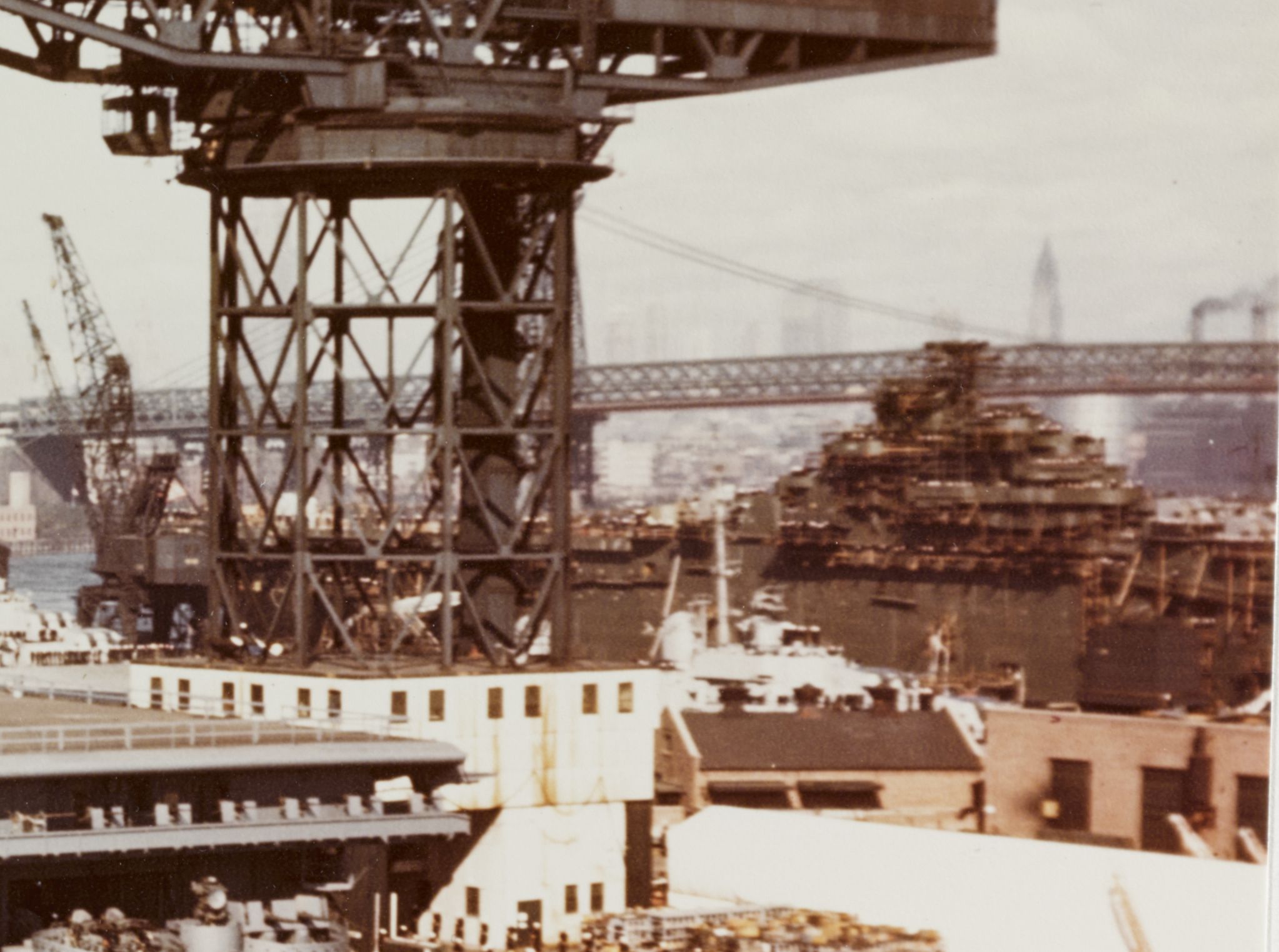 281k | View of part of the island of the former carrier Franklin (AVT-8) while she was in mothballs at Bayonne, New Jersey, circa 1960. A crane appears to be removing part of the island superstructure. National Naval Aviation Museum photo, # 1996.488.246.013. |