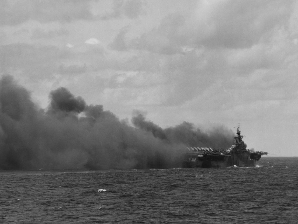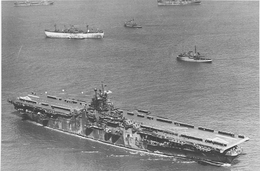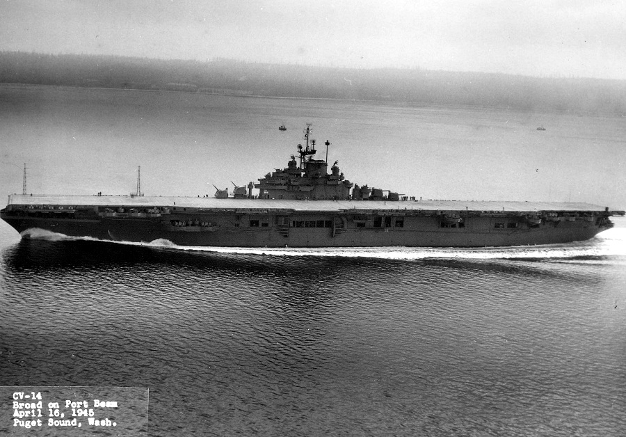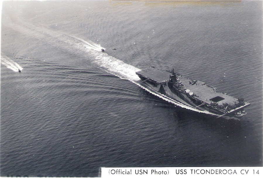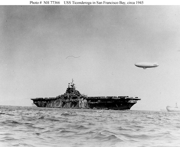 335k | USS Ticonderoga (CV-14) underway. Official USN photo. |