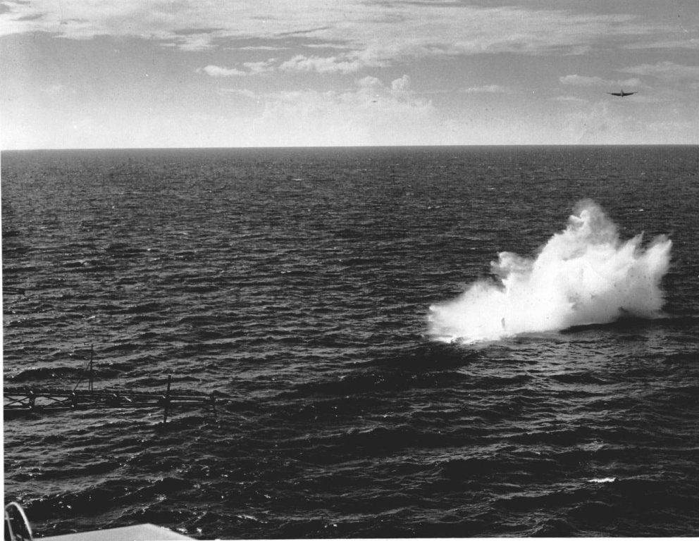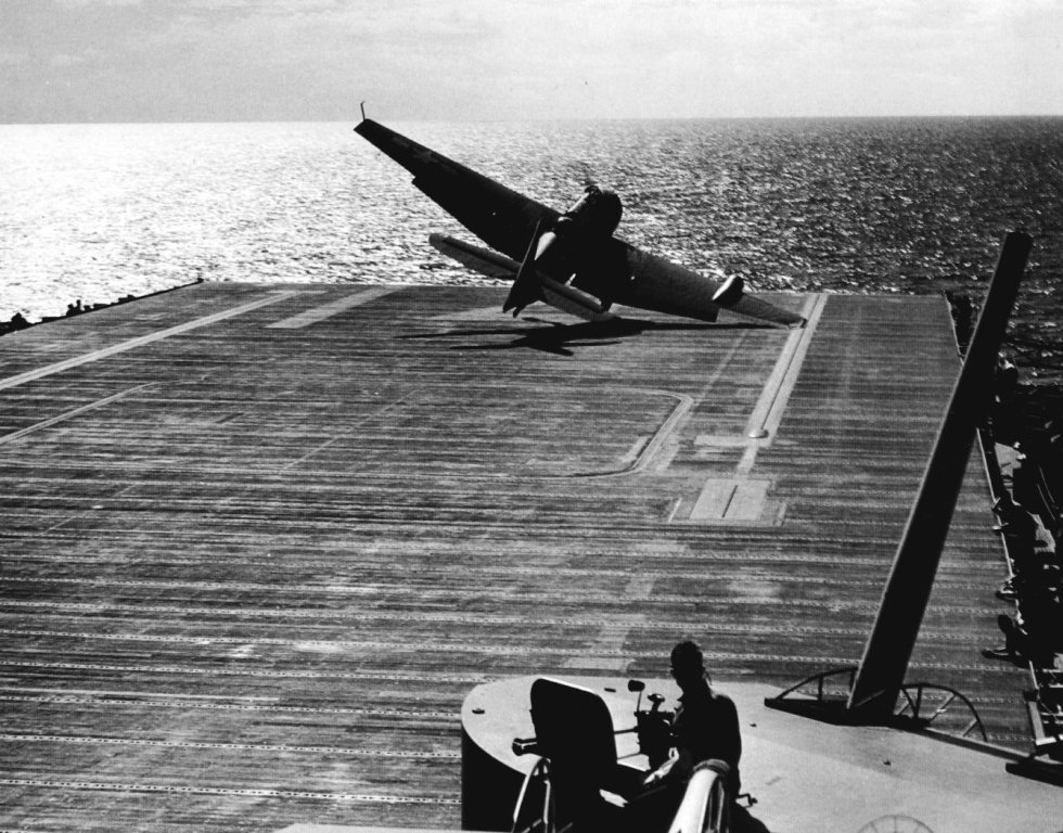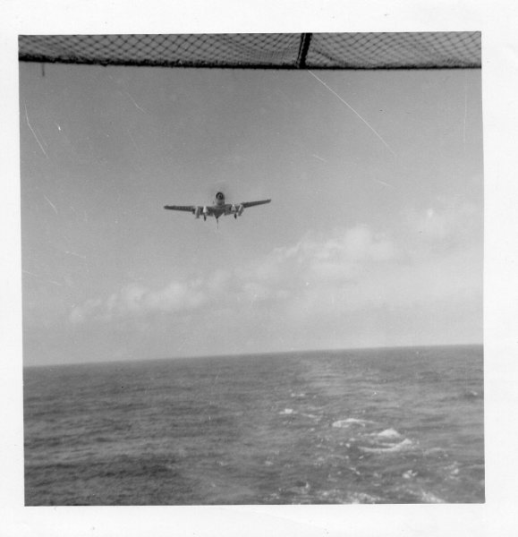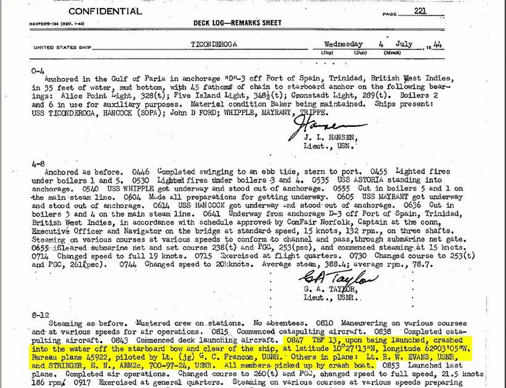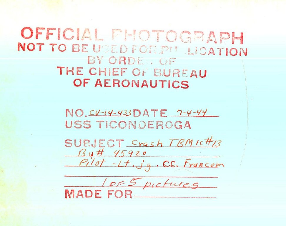 174k | Wednesday, 4 July 1944, "0847: TBF 13 [TBM-1C Avenger] upon being launched, crashed into the water off the starboard bow and clear of the ship, at latitude 10°27'13"N, longitude 62°03'05"W. Bureau plane 45922, piloted by Lt. (jg) G. C. Francom, USNR. Others in plane: Lt. R. W. Evans, USNR, and Stringer, E. N., ARM2c, 7CO-97-24, USNR. All members picked up by crash boat." (Excerpt from the ship's Deck Log.) |