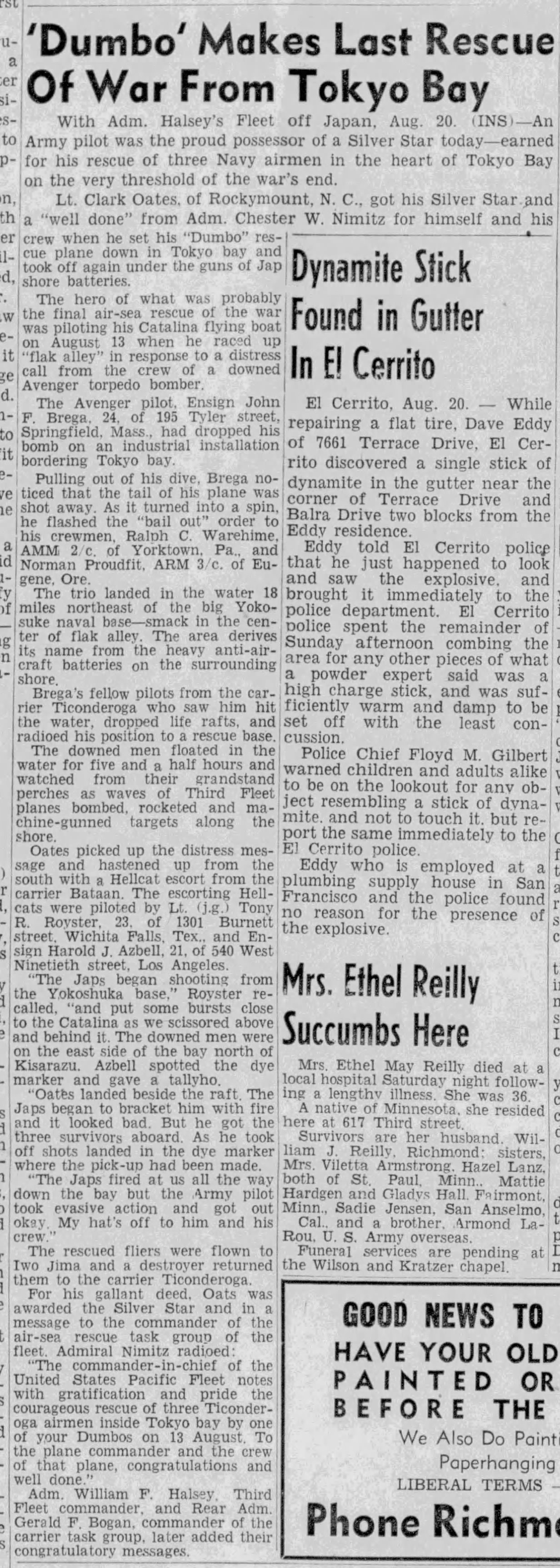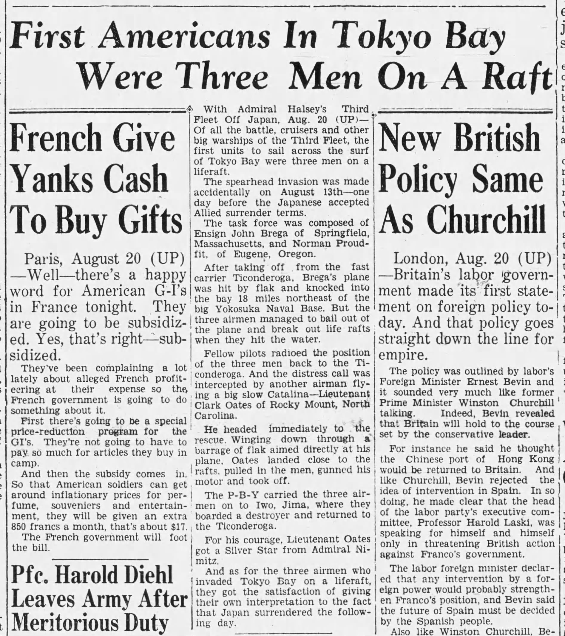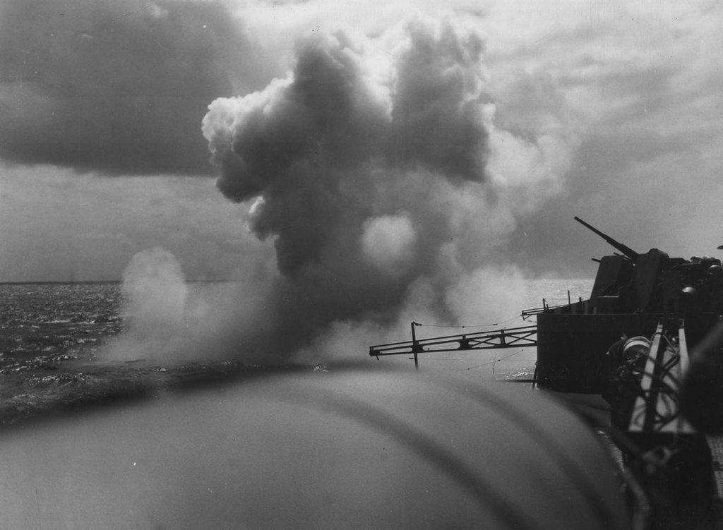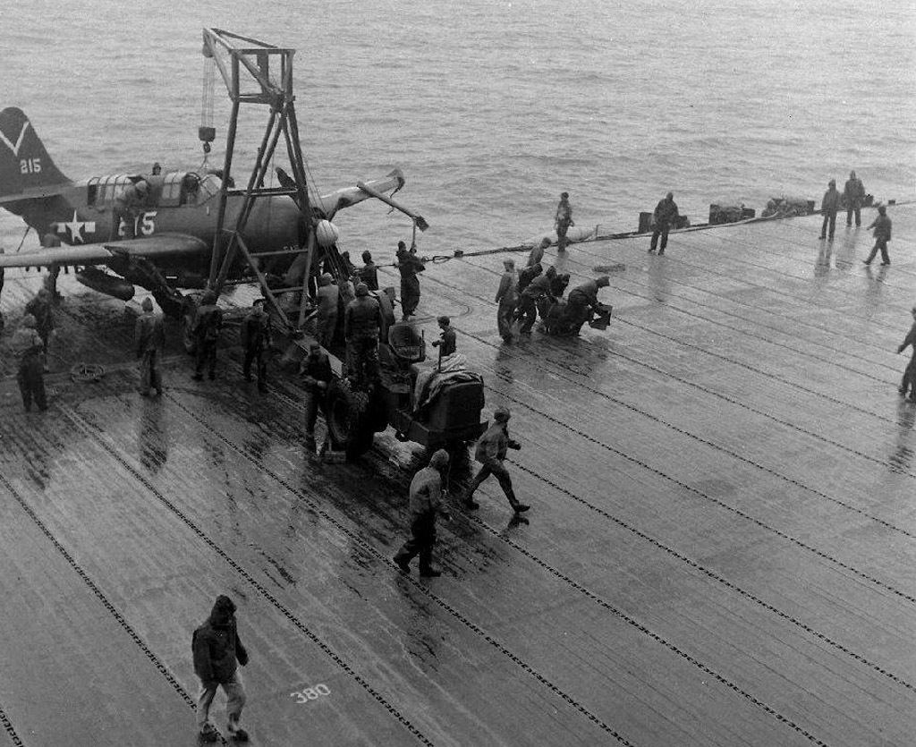 174k | Wednesday, 4 July 1944, "0847: TBF 13 [TBM-1C Avenger] upon being launched, crashed into the water off the starboard bow and clear of the ship, at latitude 10°27'13"N, longitude 62°03'05"W. Bureau plane 45922, piloted by Lt. (jg) G. C. Francom, USNR. Others in plane: Lt. R. W. Evans, USNR, and Stringer, E. N., ARM2c, 7CO-97-24, USNR. All members picked up by crash boat." (Excerpt from the ship's Deck Log.) |