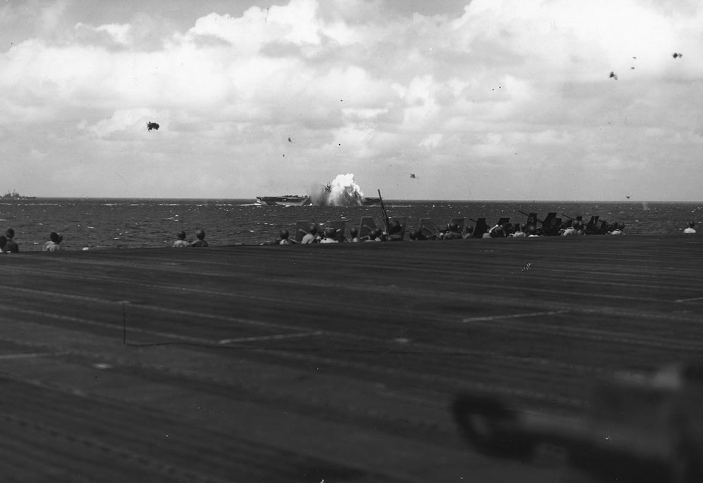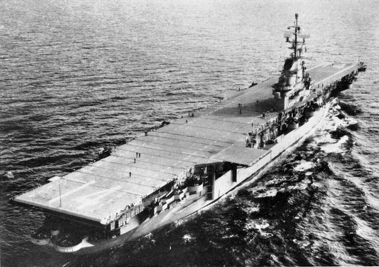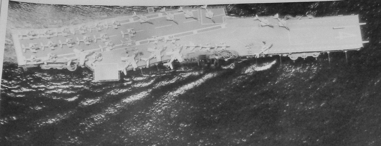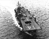 115k | Another photo taken on 30 May 1944. Flight deck was stained a dark blue, with the hull number painted in Dull Black and the dashed lines in light gray. Note the port elevator, opposite the island structure, is in the stowed position. A pair of 40mm quad mounts are visible on the forecastle, as well as a pair of catapults forward, on the flight deck. |