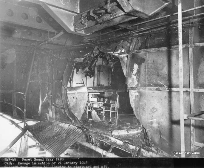 212k | "The date was 1 July 1944 while Ticonderoga was on her shakedown cruise in Trinidad. The pilot was ENS John G. Fraifogl who was only mildly injured in this incident." Deck log reads: "1717 Second plane aboard, F6F-4 [in fact, an F6F-5 Hellcat from VF-80, Squadron #4], BuAero serial number 58613, pilot Ensign J. G. FRAIFOGL, USNR, made normal landing, belly tank detached itself from plane, hit flight deck, ignited. Plane badly damaged—to be surveyed—." |