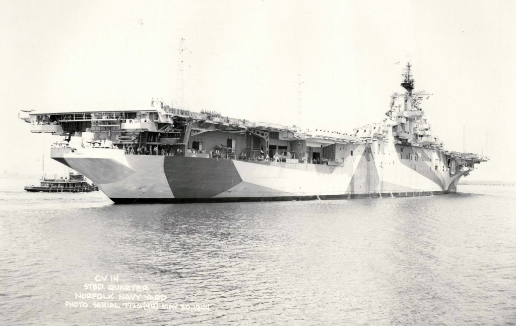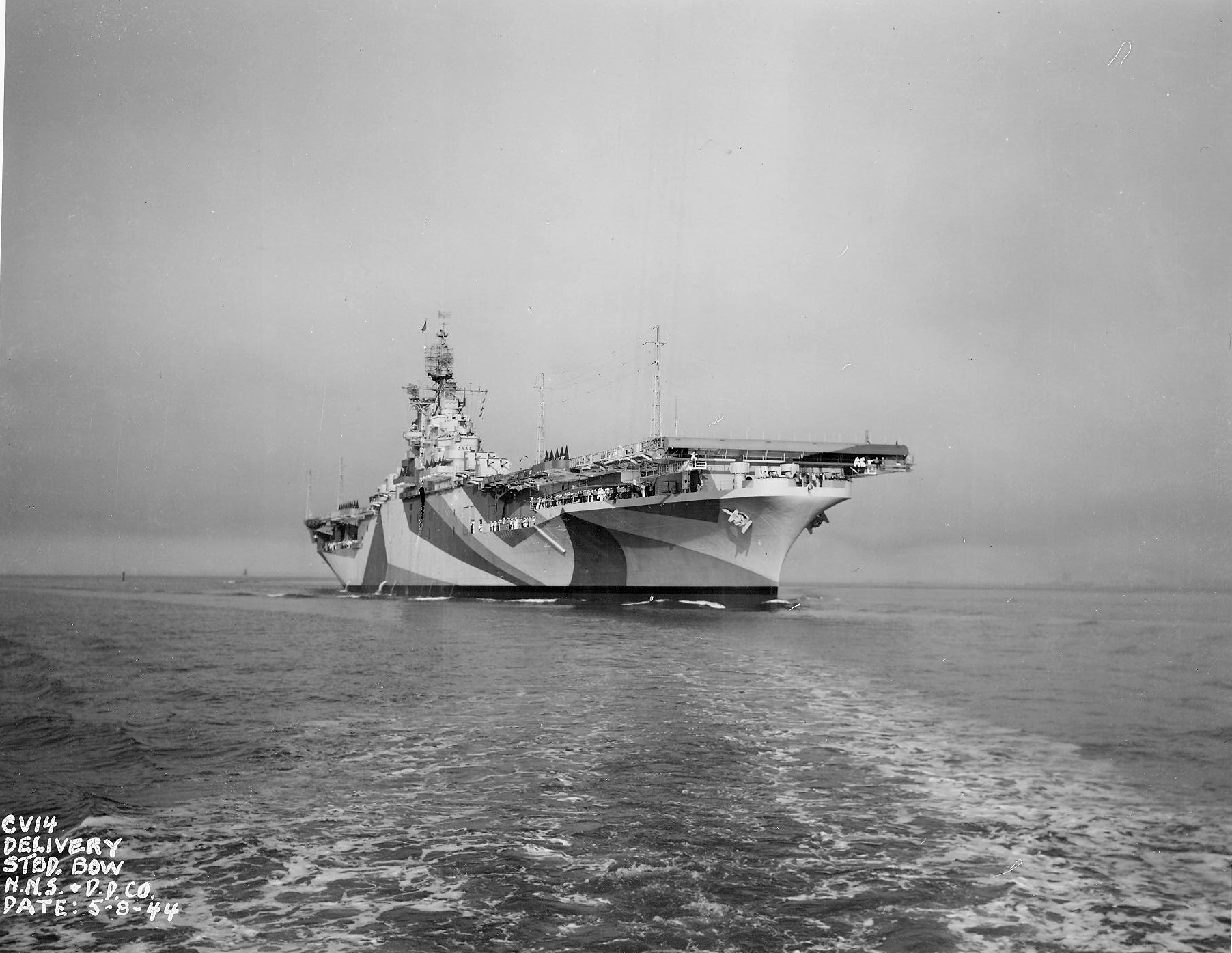 503k | USS Ticonderoga (CV-14), starboard bow, at delivery. Newport News & Dry Dock Company. Date: 8 May 1944. Camouflage Measure 33, Design 10A. Vertical colors were: Navy Blue (5-N), Ocean Gray (5-O), and Light Gray (5-L). |