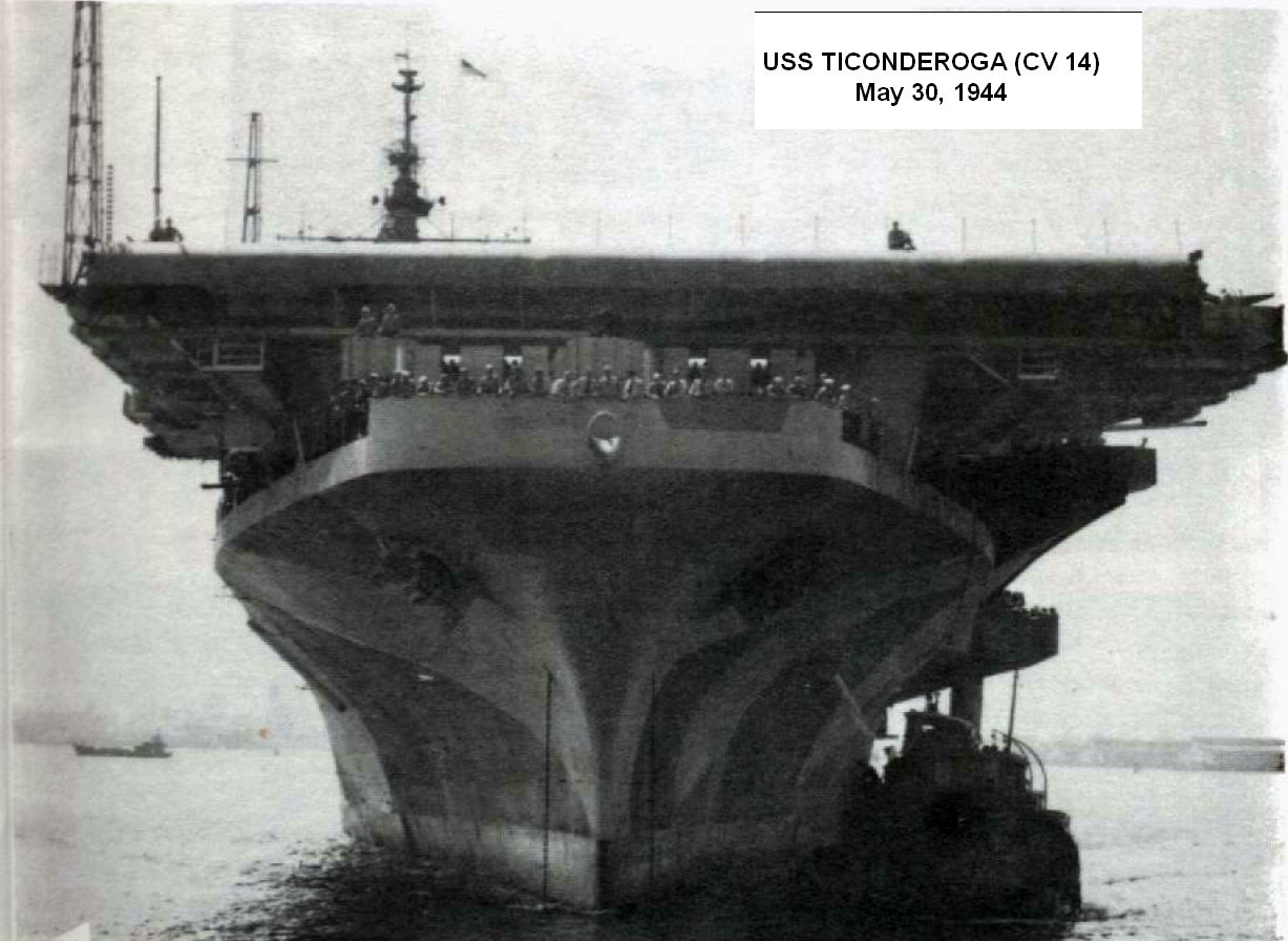 105k | Ticonderoga (CV-14), port quarter, bow view, 22 April 1944, Newport News Shipbuilding & Dry Dock Co. photo. |