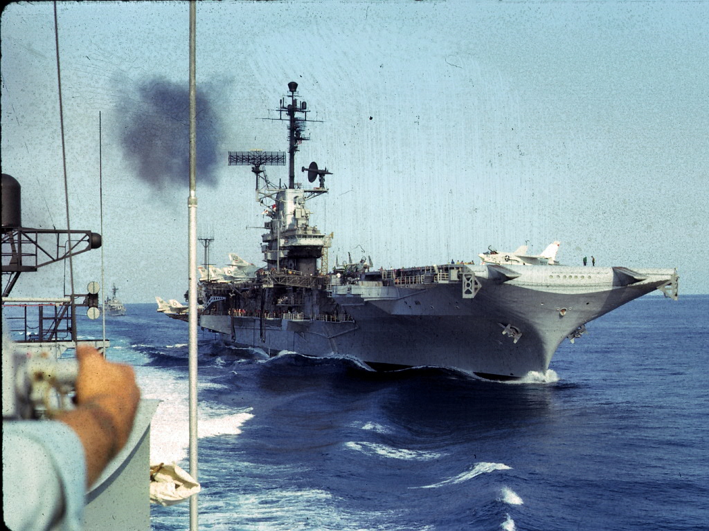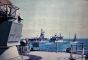 306k | USS Hassayampa (AO-145) refueling USS Ticonderoga (CVS-14) and a Knox-class destroyer escort. Ticonderoga, with assigned Carrier Anti-Submarine Air Group (CVSG) 53, was deployed to the Western Pacific from 17 May to 29 July 1972. US Navy photo from the Ticonderoga 1972 cruise book. |