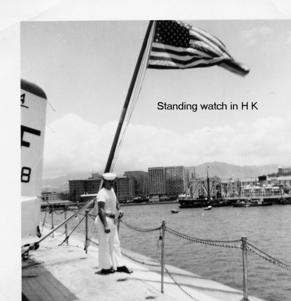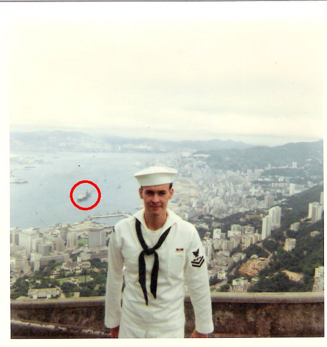 62k | Hong Kong, June 1969. Tom, in a photo taken by Bob Kazdan, AE2, from Victoria Peak, looking down at the harbor. USS Ticonderoga (CVA-14) is in the background (circled)—a good perspective of harbor's and Tico's size. |