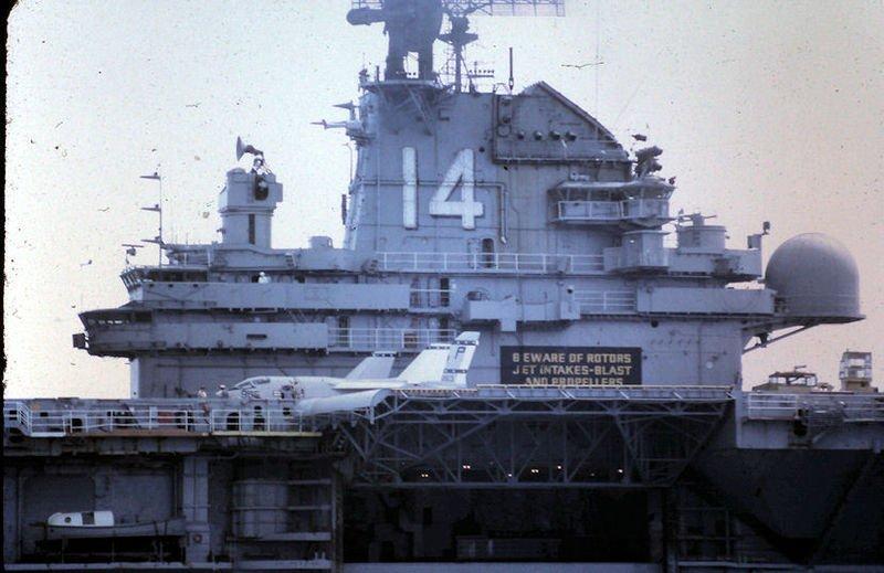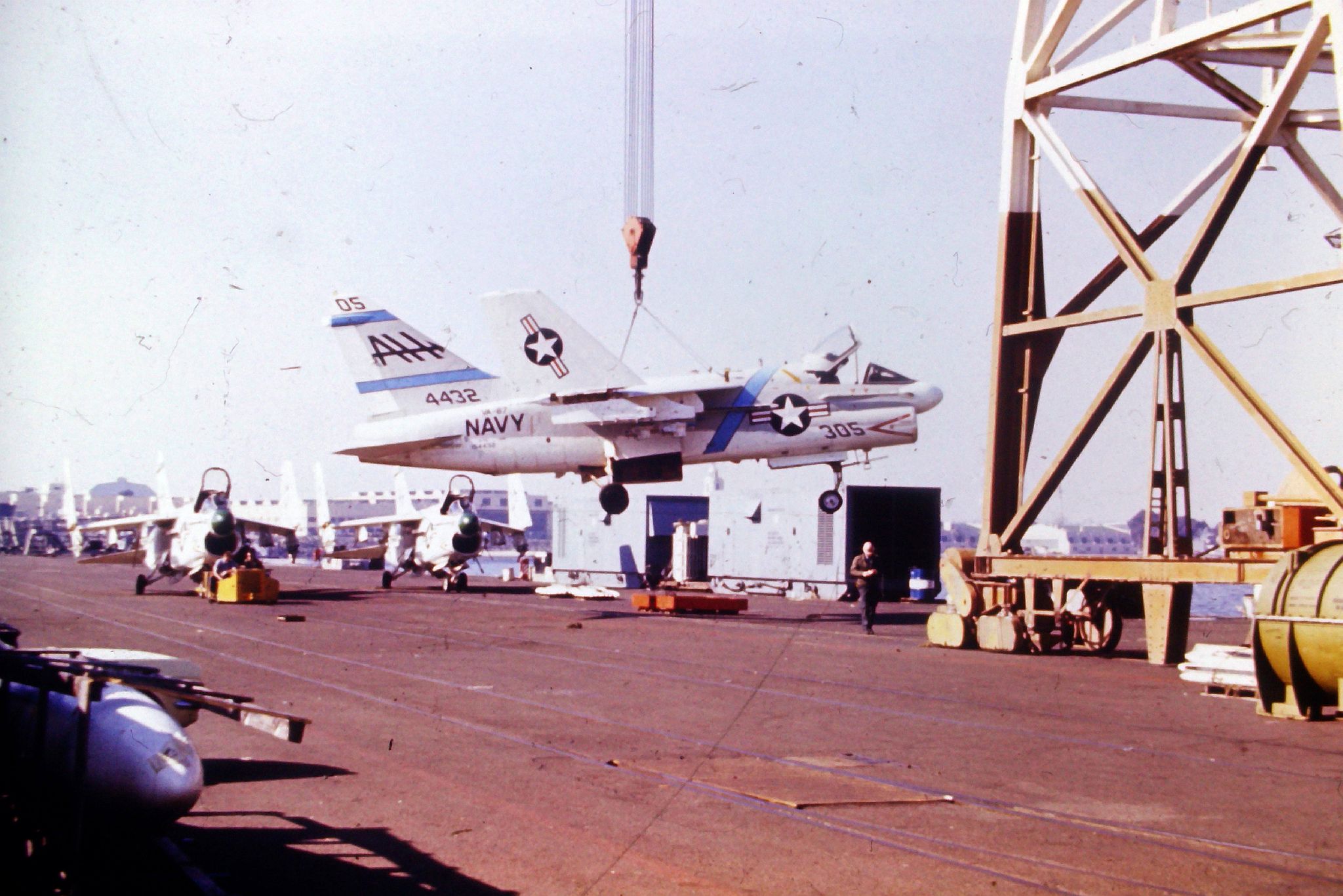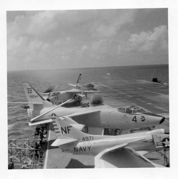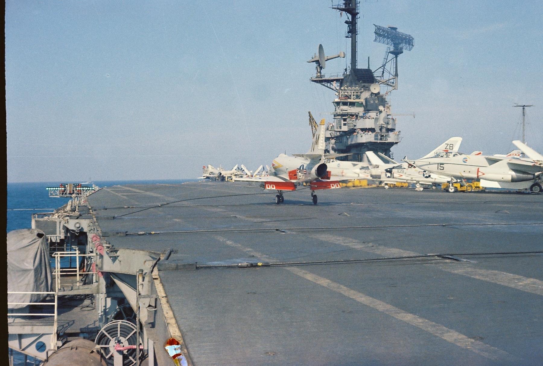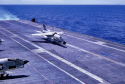 41k | VA-87 "Golden Warriors" A-7B Corsair II (BuNo 154424, modex AH-312) shuttling to cat. (Converted to TA-7C in 1976, put into storage in 1991 and sold to the Greek Air Force in 1995.) |