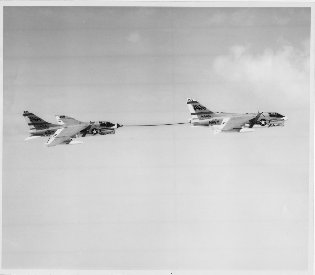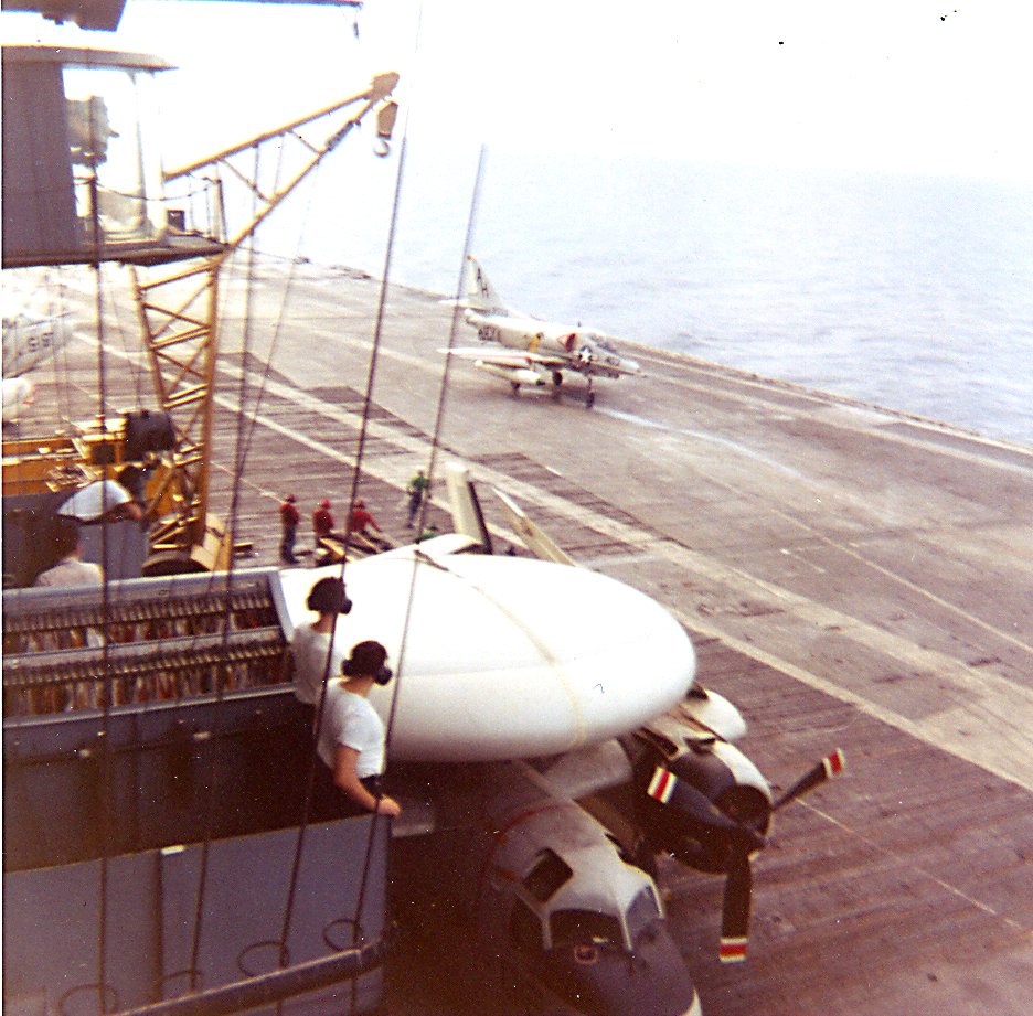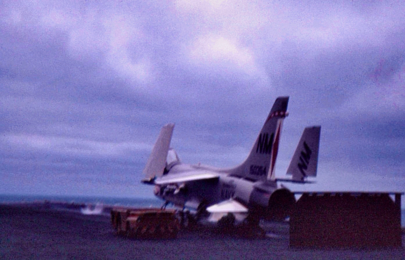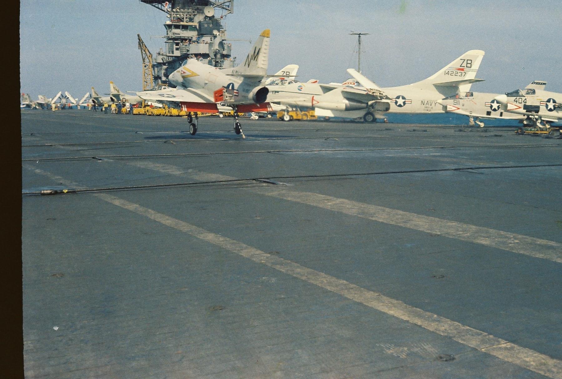 41k | VA-87 "Golden Warriors" A-7B Corsair II (BuNo 154424, modex AH-312) shuttling to cat. (Converted to TA-7C in 1976, put into storage in 1991 and sold to the Greek Air Force in 1995.) |