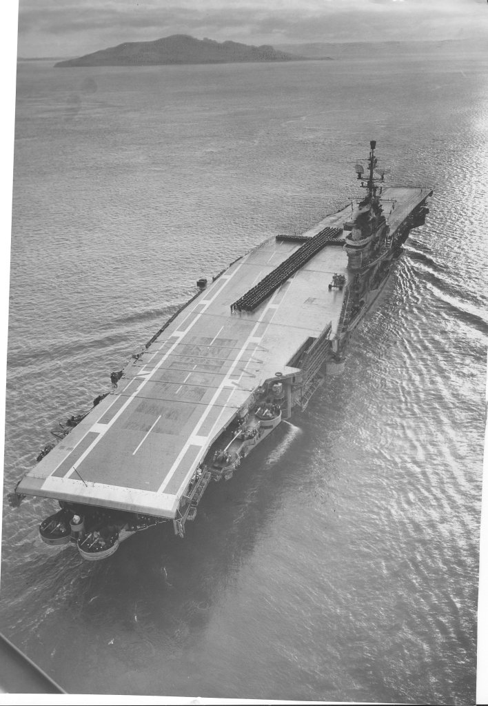 99k | USS Ticonderoga (CVS-14) with her rails manned, circa 1970-72, following conversion to an anti-submarine warfare support aircraft carrier. Official U.S. Navy Photograph, from the collections of the Naval Historical Center (photo # NH 97488-KN). Joe Cross adds: "I was aboard the USS Bronstein, an escort ship of the Ticonderoga. We were going through the Sunda Straits and had a memorial service for two cruisers that were sunk 28 February 1942 [USS Houston and HMAS Perth]. I have an identical picture in my cruise book but it includes all the escorts. The calm seas that day are a dead giveaway that the picture was taken on April 24th 1971. It was such a calm day that the seas were almost like glass. A rarity." |