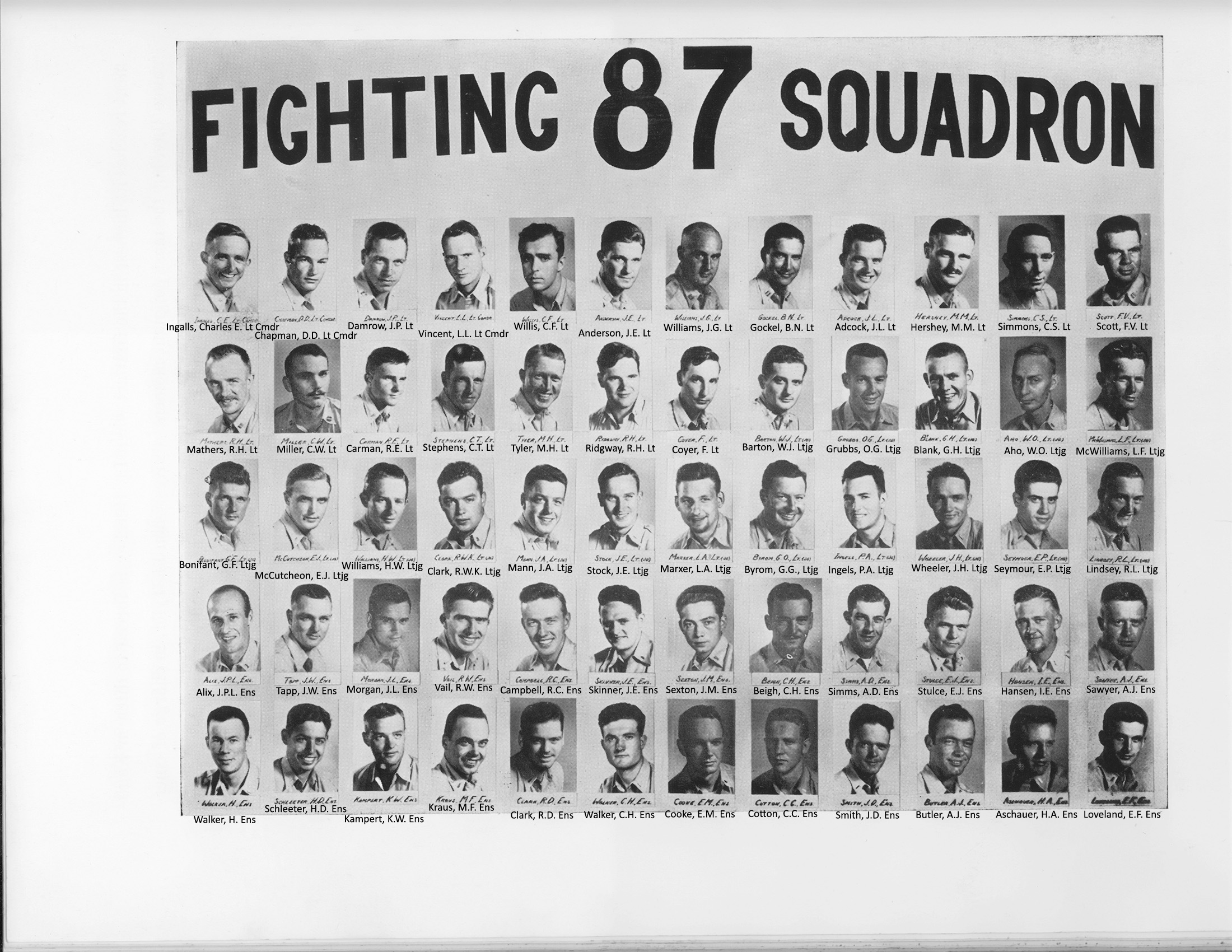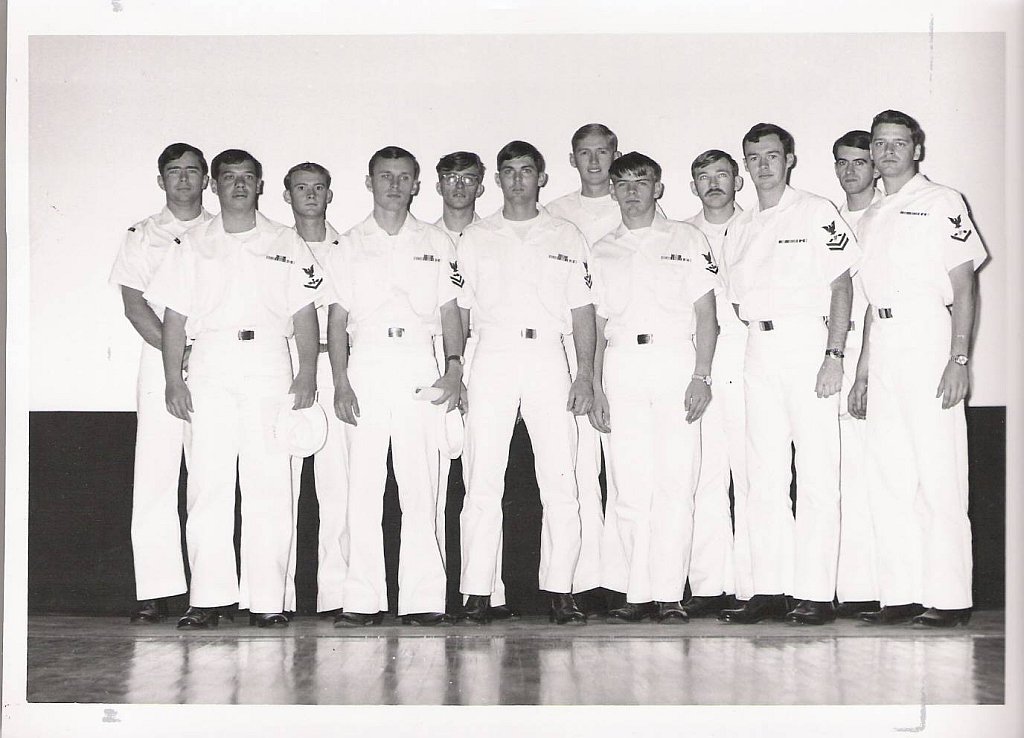 107k | VA-87 "Golden Warriors" awarded a Meritorious Service Citation, Vietnam Cruise, 1969. Back row (l to r): R. Kazdan AE2, J. Pierce AO3, D. Ferguson AE3, D. Drake AN, D. Nelson ATN2, J. Miller AQB2. Front row (l to r): P. Inferrera AO3, J. Tilton AE3, D. Dewolf AO2, J. Mooney AO3, T. E. Rostkowski ATN2, N. D. Moran AN. |
