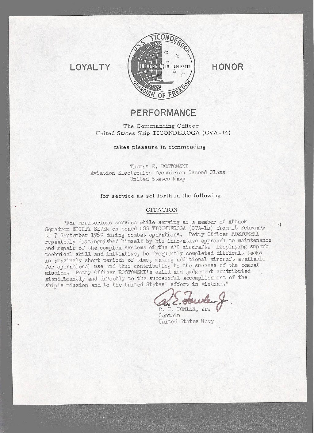 318k | Meritorious Service Citation awarded to Thomas E. Rostkowski, ATN2, of VA-87 "Golden Warriors." Signed by CAPT R.E. Fowler, Jr., Commanding Officer, USS Ticonderoga (CVA-14). |