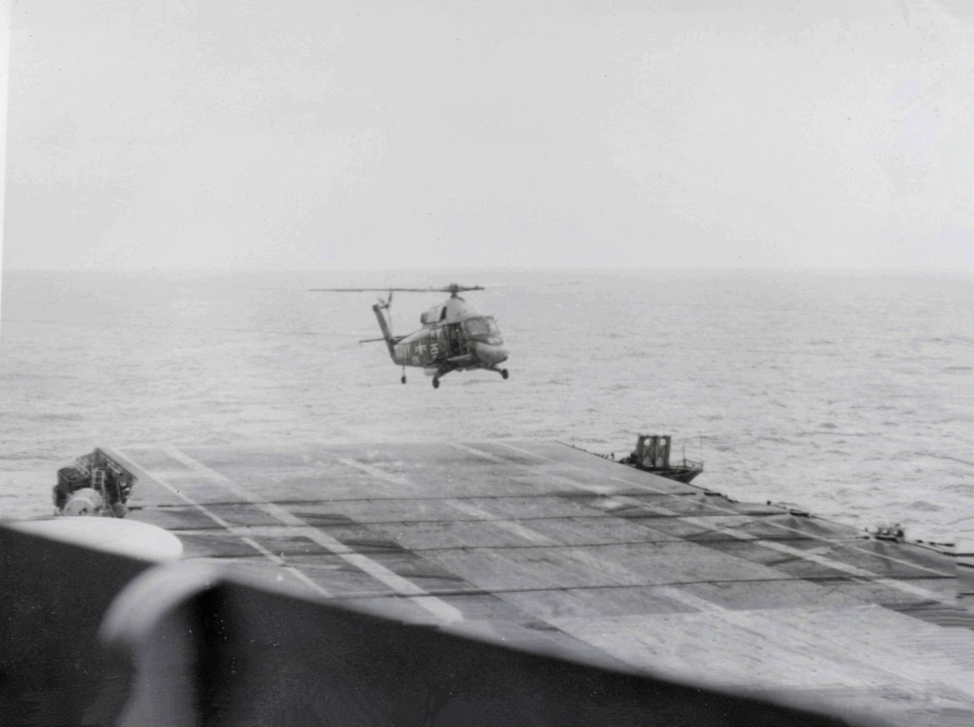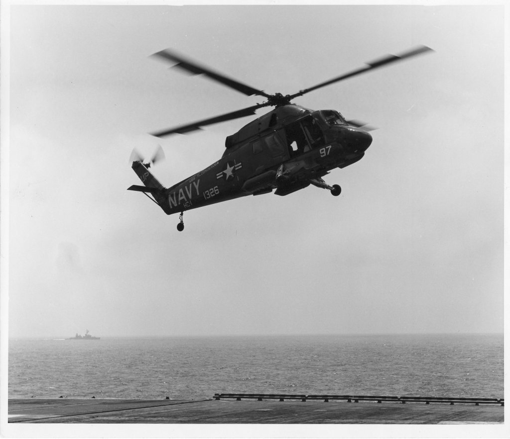787k | A US Navy SH-3G Sea King helicopter (BuNo 149930, modex UP001) of Helicopter Combat Support Squadron (HC) 1 "Pacific Fleet Angels" during Apollo 17 recovery operations, 19 December 1972, with the aircraft carrier USS Ticonderoga (CVS-14) in the background. Official National Aeronautics and Space Administration (NASA) photo, # AP17-S-72-55974HR. |