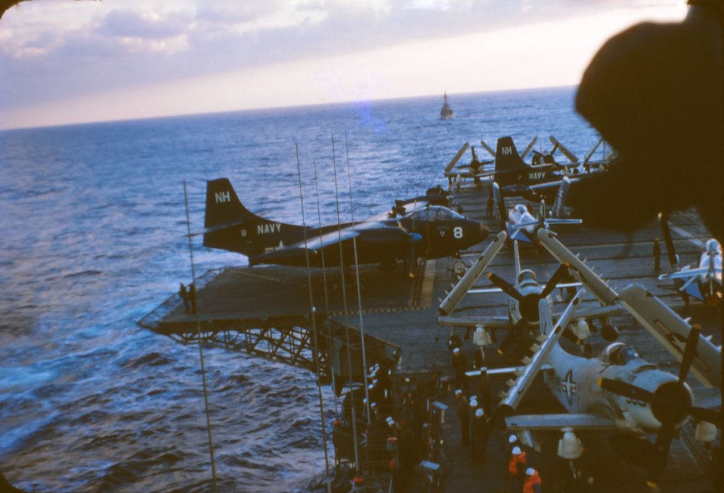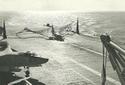 151k | VF-162 "Hunters" F-8J Crusader launching with afterburner from USS Ticonderoga (CVA-14) during combat operations, Gulf of Tonkin, 1969. (All that can be seen is the AB flame over the starboard bow.) |