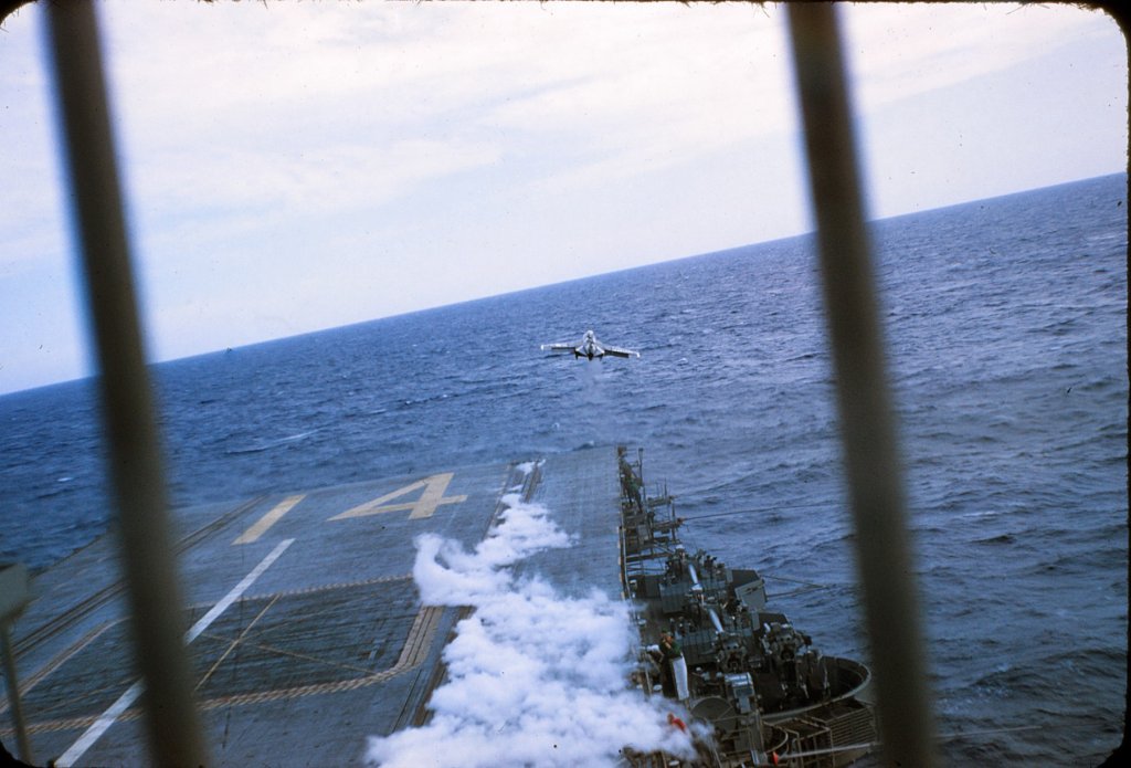86k | VA-87 "Golden Warriors" A-7B Corsair II launching from USS Ticonderoga (CVA-14) during combat operations, Gulf of Tonkin, 1969. |