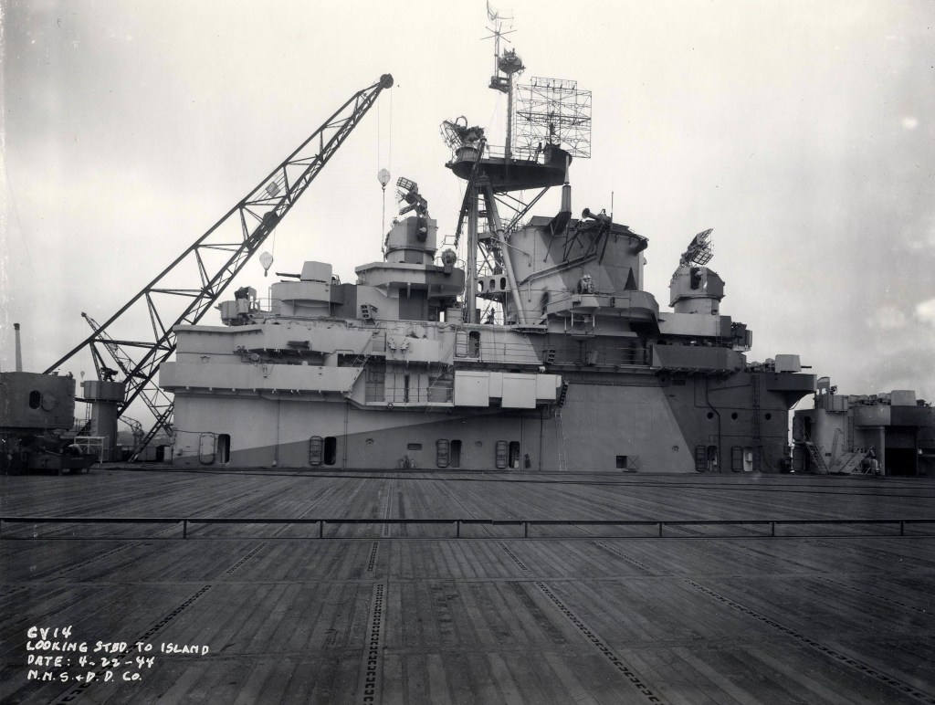 160k | Ticonderoga (CV-14), looking starboard to island, 22 April 1944, Newport News Shipbuilding & Dry Dock Co. photo. |