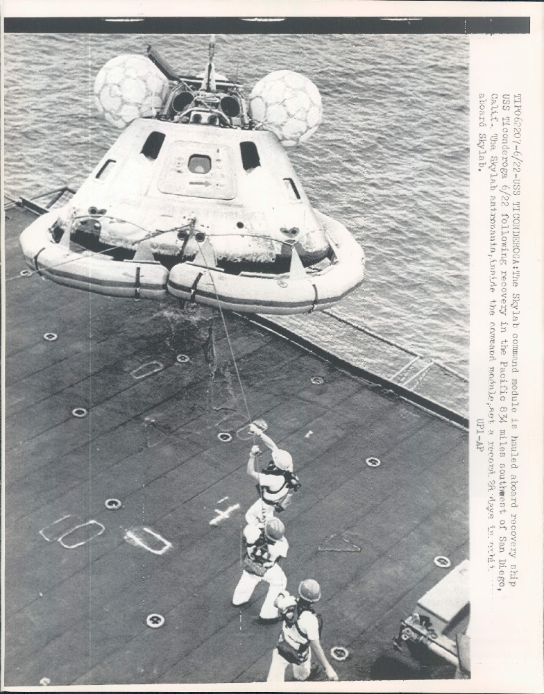 564k | "TIP062207-6/22-USS TICONDEROGA: The Skylab command module is hauled aboard recovery ship USS Ticonderoga [22 June 1973] following recovery in the Pacific 834 miles southwest of San Diego, Calif. The Skylab astronauts, inside the command module, set a record 28 days in orbit aboard Skylab. UPI-AP" |