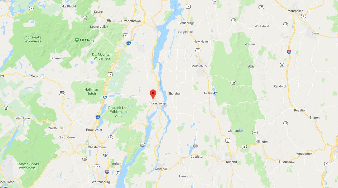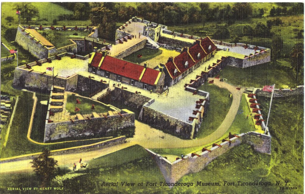 108k | Ticonderoga is a village in Essex County, N.Y., on La Chute River, 100 miles north of Albany (NS0214aua). The name is an Iroquois Indian term which means "between two lakes" and refers to Lake George and Lake Champlain. Here, the French built a fort called Carillon in 1755, but it was captured four years later by British troops under General Amherst. Early in the American Revolution, on 10 May 1775, Ethan Allen and his "Green Mountain Boys" captured the fort from the British. General Sir John Burgoyne recaptured the fort in May 1777, holding it until his surrender at Saratoga, N.Y., on 17 October 1777. Three previous US warships had borne the name: