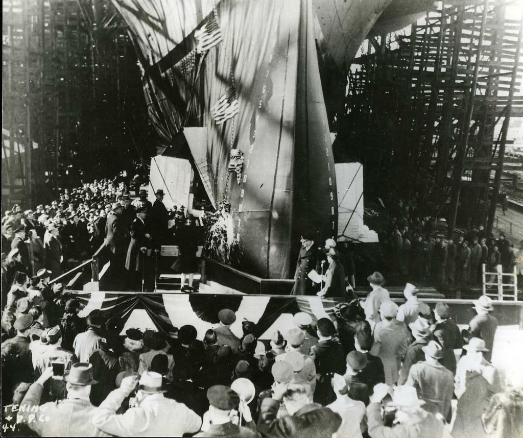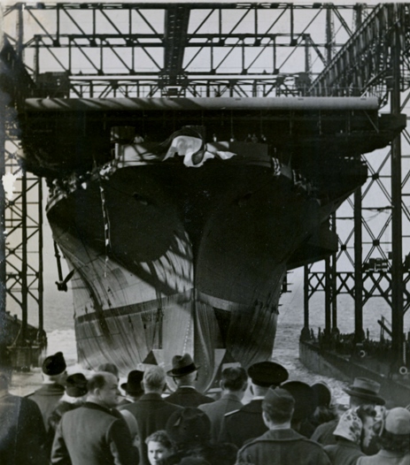 136k | [Monday, 7 February 1944]. "Newport News, Va.—At launching ceremonies for the newest U.S. Navy aircraft carrier Ticonderoga, Miss Stephanie Sarah Pell of Pelham Manor, N.Y., swings the champagne bottle past the warship's huge bow—a clean miss. On the next try, however, Miss Pell's aim improved and the flattop was properly christened." |